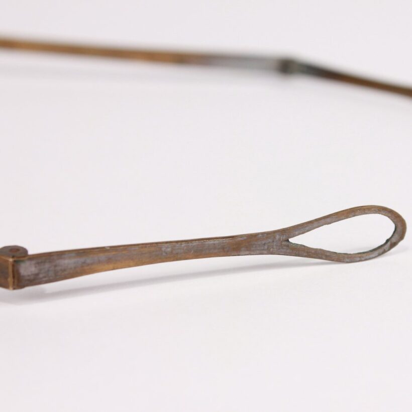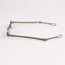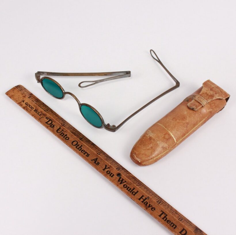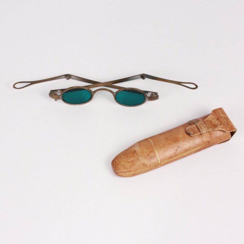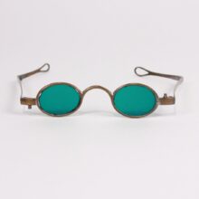 Wonderful pair of early tinted spectacles, c. 1830s. The lenses are a rich shade of green and the frame design is inventive and sculptural, with hinged temple extensions. These curious specs were not originally designed as sunglasses but rather as corrective lenses under the belief that green or blue-tinted glass aided eyesight. Making them especially unusual, the specs retain their original gilded and tooled-leather case, of a kind that seldom survives. An exceptional example of early nineteenth-century eyeglasses.