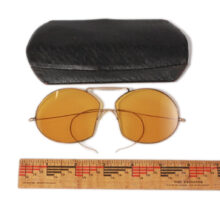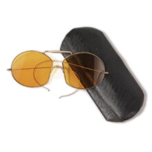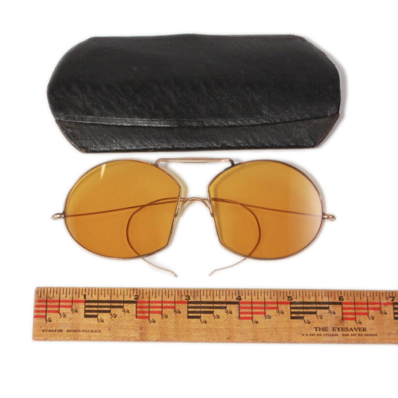 Early automobile driving goggles with amber lenses, c. 1910s. I’ve never seen these crazy-shaped lenses before. Gold-filled wire frames with temples that loop around your ear to keep the glasses in place (for those hair-raising turns in your 1912 Hupmobile). Original case included. In excellent, practically new condition, these one-hundred-year-old specs still feel high-style and fresh to a contemporary eye today.