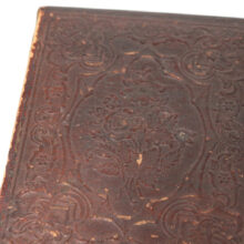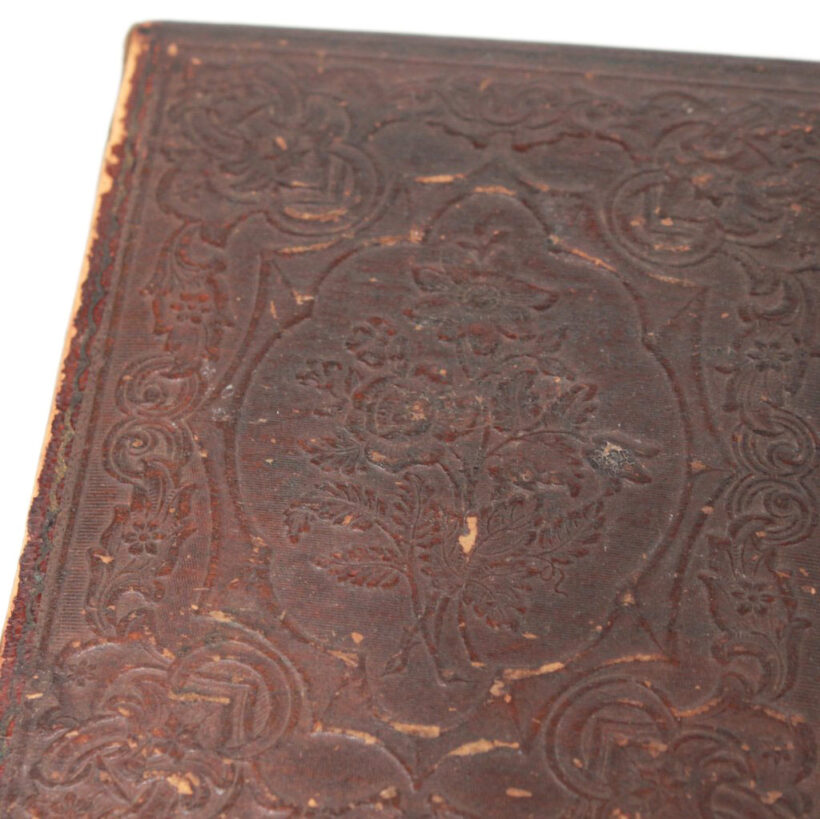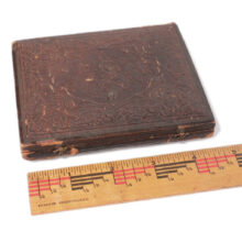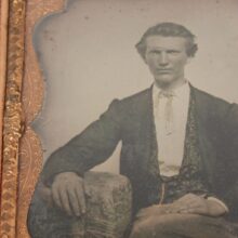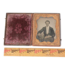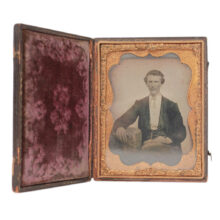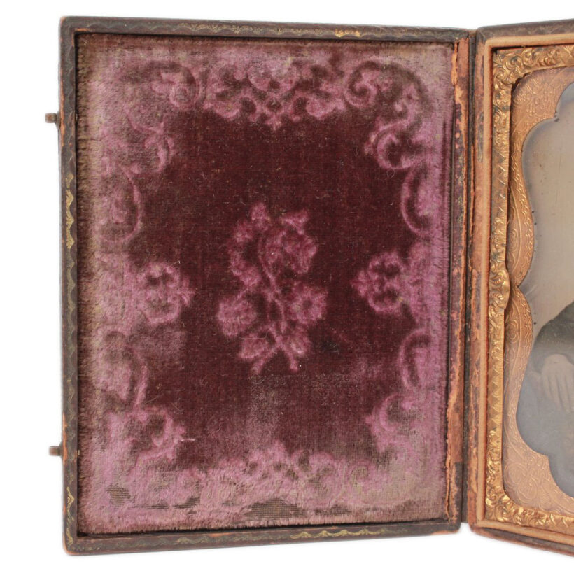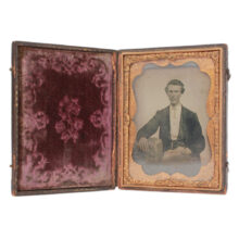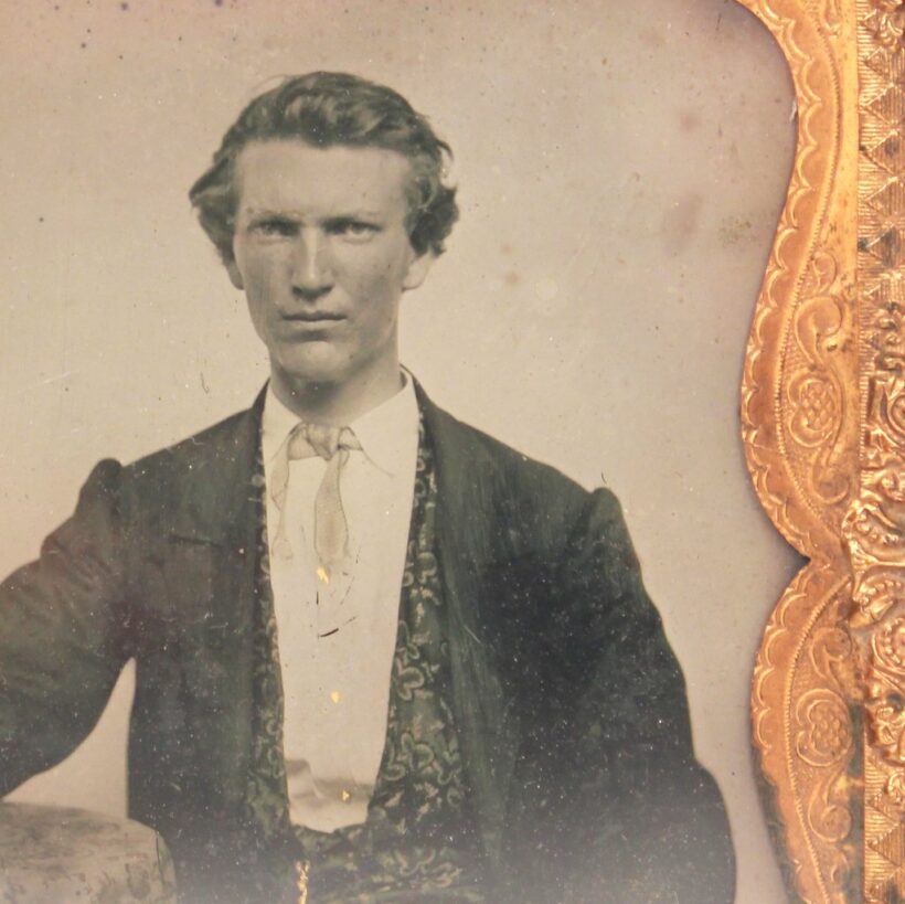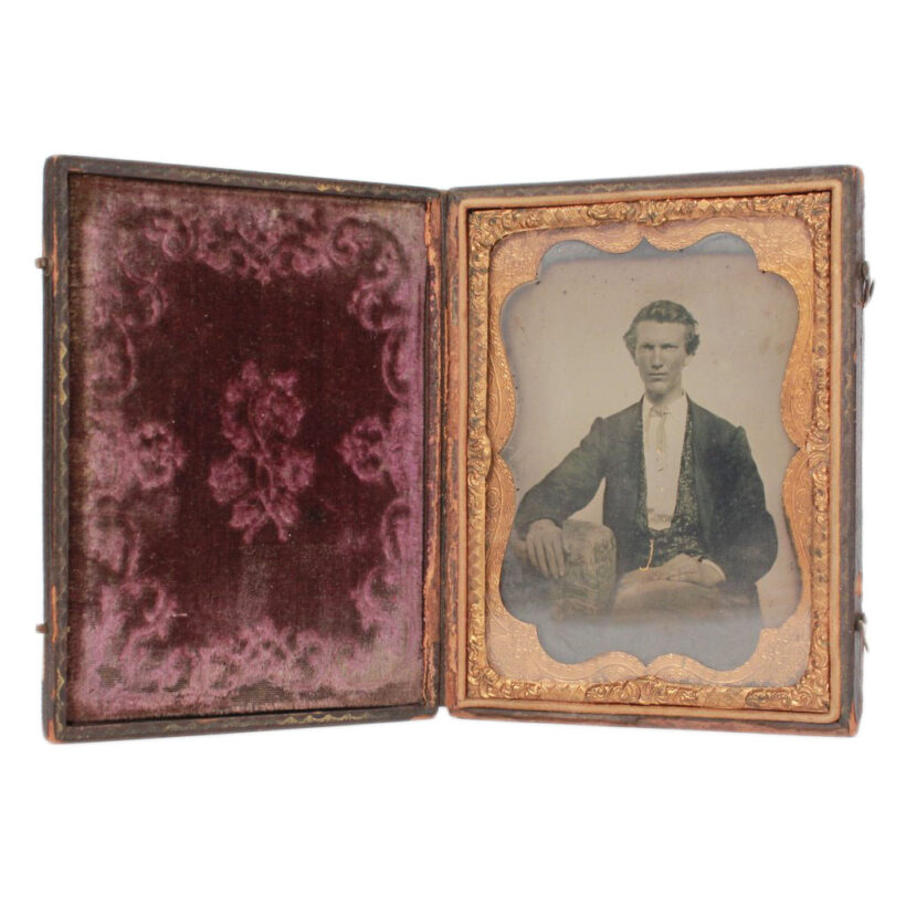 Antique quarter-plate ambrotype portrait of a striking gentleman in case, c. 1860s. The image has hand-painted highlights, including his watchchain, green jacquard waistcoast, and devil-may-care necktie knot. The case is original to the image and has aged handsomely, with the sumptuous plum-colored velvet lining faded to perfection.