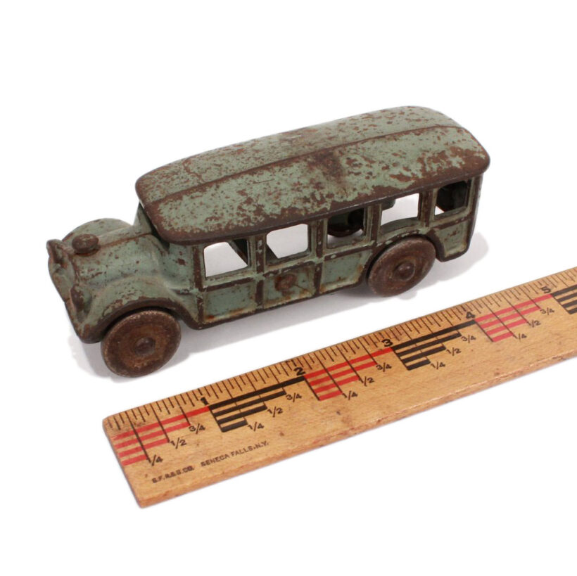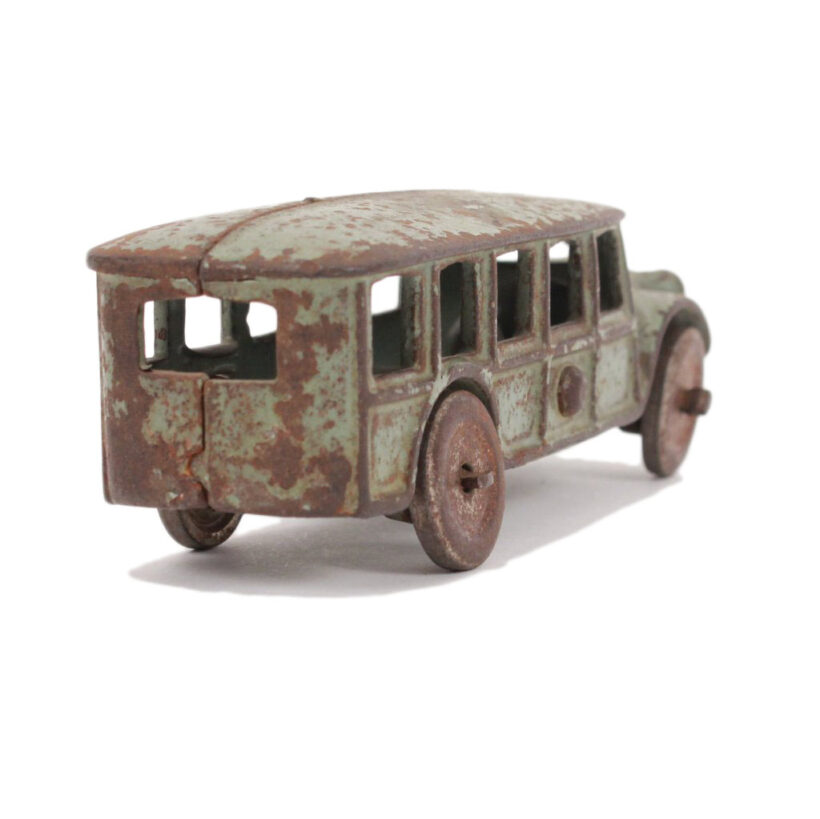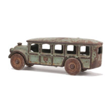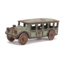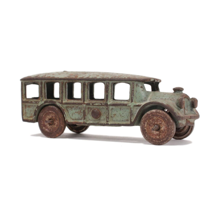 Antique cast-iron Arcade toy bus, c. 1920. Great form, color, and well-played with surface.