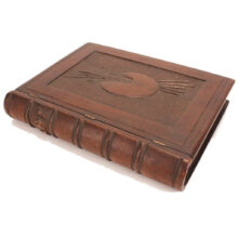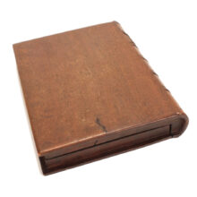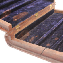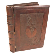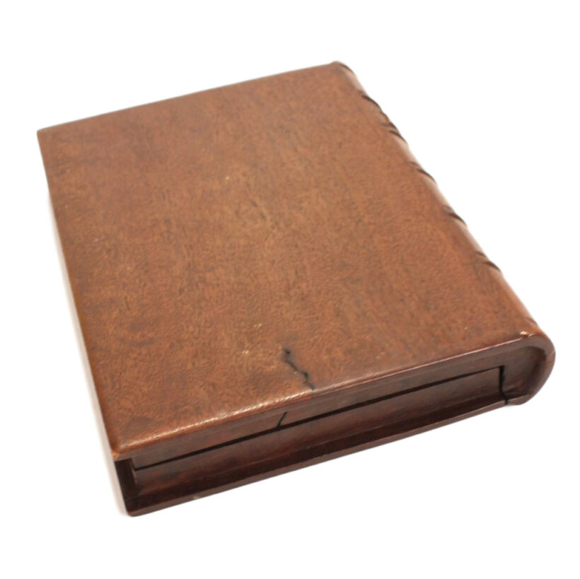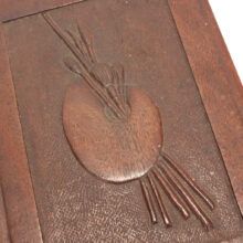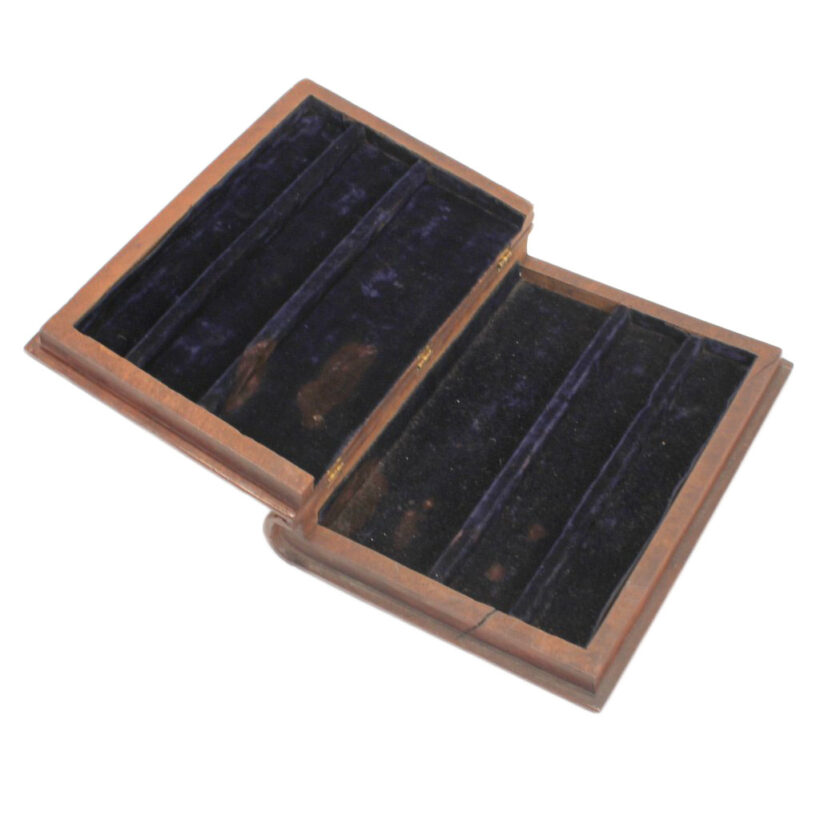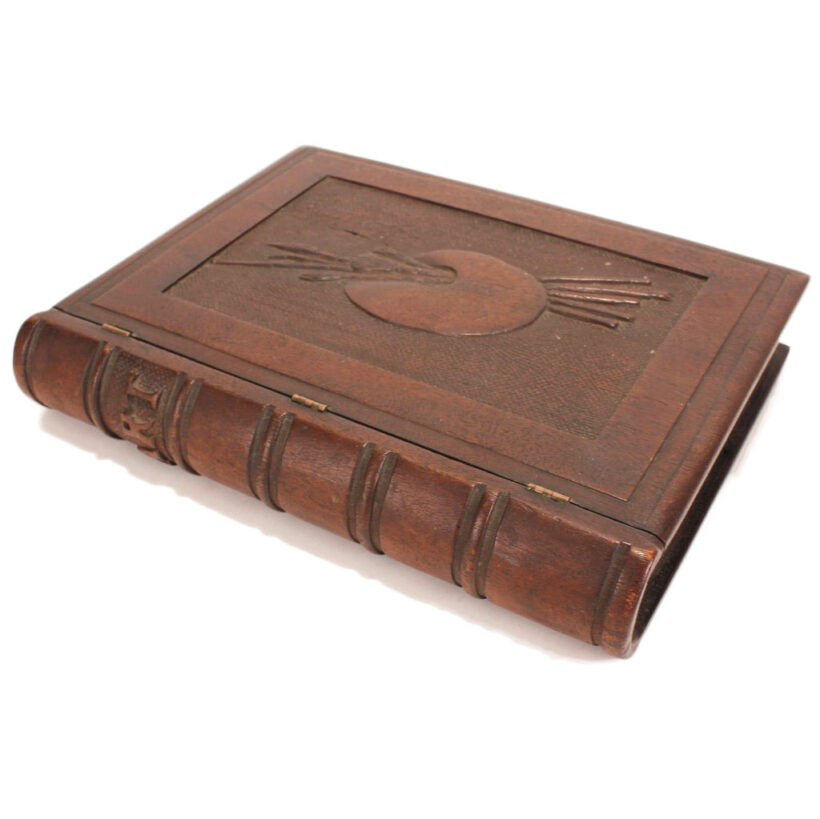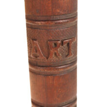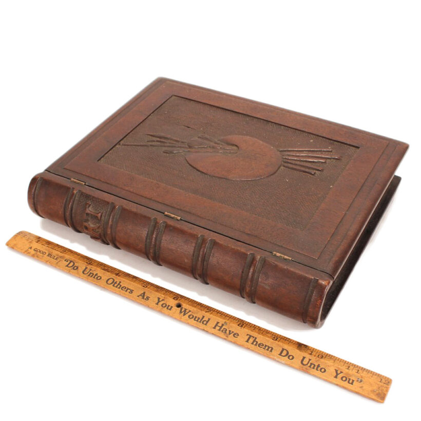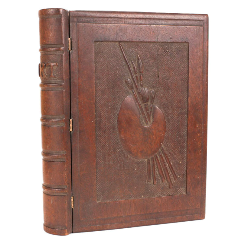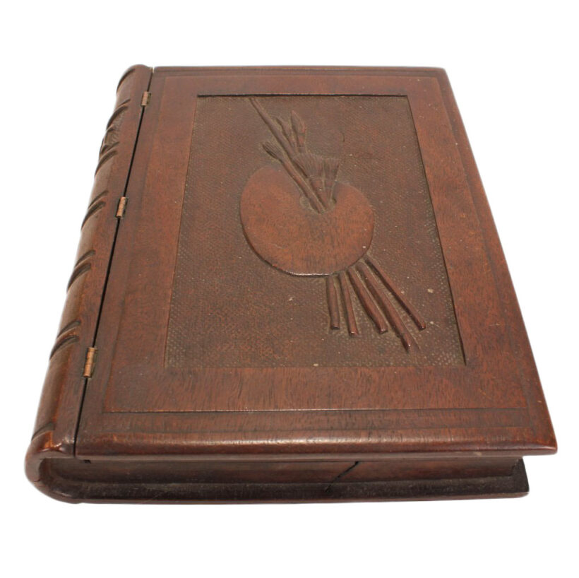 Antique Victorian mahogany trompe l’oeil box in the shape of a book, c. 1880s. Exquisitely carved relief of a palette and brushes on the cover with detailed work also on the spine, on which is written “Art” as the wooden book’s title in capital letters. The box is lined with midnight blue velvet and is compartmentalized, perhaps originally holding art supplies such as calligraphy pens or ā who knows ā possibly for the display of miniature works of art. A wonderful folk art carved book box with exceptional detail ready for a new artistic author to fill it up.