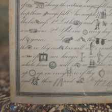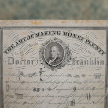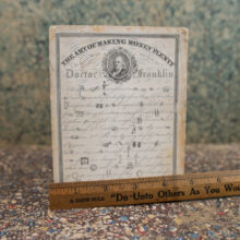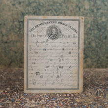 Rare original print of Doctor Franklin’s advice for “Making Money Plenty” encrypted with pictorial representations of words as a rebus puzzle, a device which Franklin played upon in other works as well. A steel engraving, the print is highly detailed on glossy card stock.