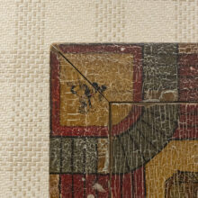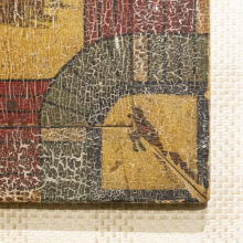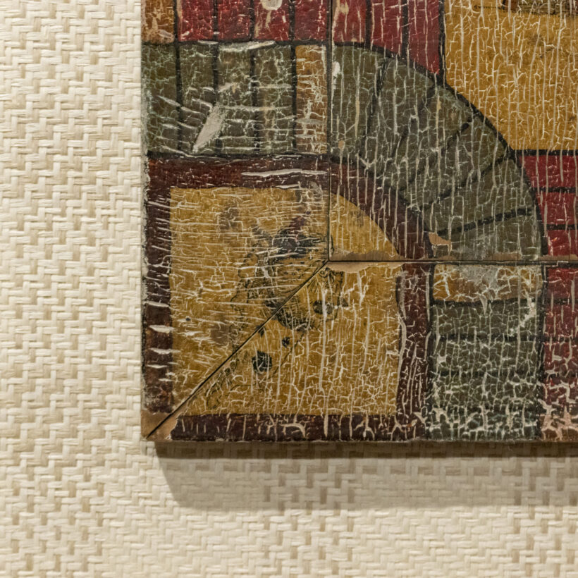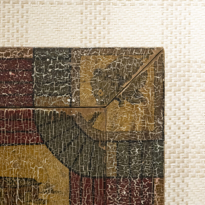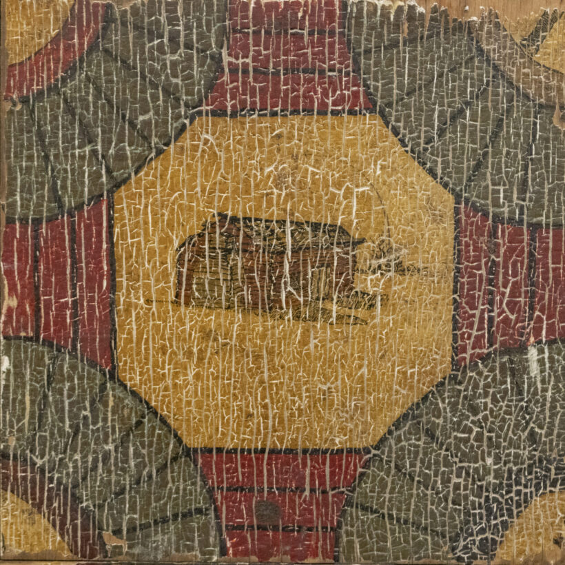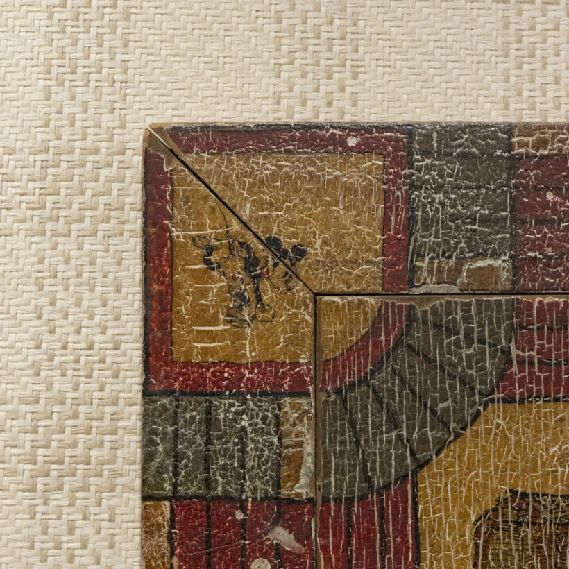 Folk art game board with extraordinary aged surface. With the “home” space depicting a log cabin and the corners painted with Disney characters, this folk art game board was in all likelihood made by a member of the family who played it down to the bare wood. Crazy-good “attic finish” paint craquelure.
