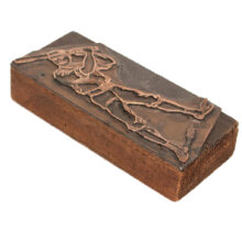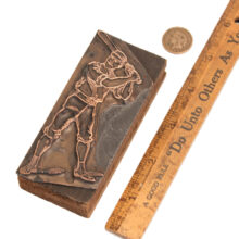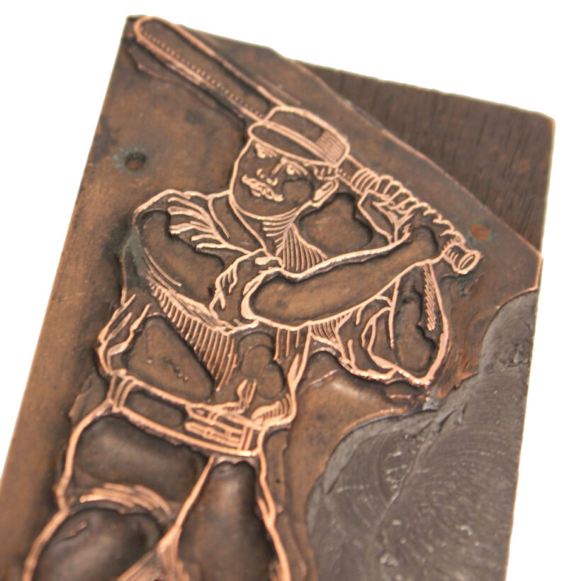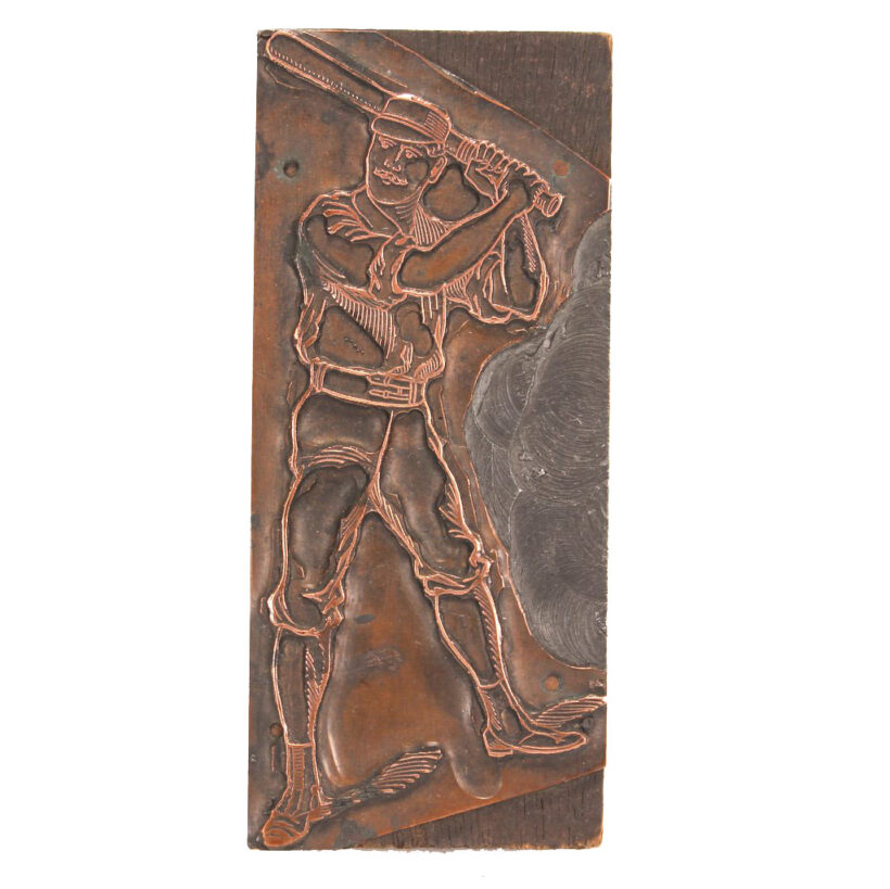 Rare antique copper printer’s block of a baseball player, c. 1880s-1890s. At four inches tall, the early baseball image would have been used to print baseball sports pages, sporting goods advertising, and perhaps even posters advertising games. The copper and wood block displays well and has a handsome vintage patina, though could be polished to a brighter shine should the buyer wish to do so. There is a hole in the back of the block so it can easily be hung on the wall. A rare and unique piece of early baseball history. Sold at auction with no reserve and free shipping.