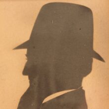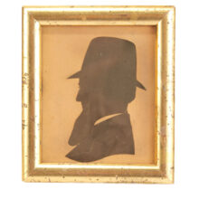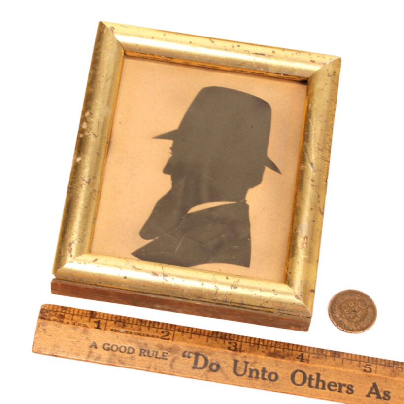 Cut paper silhouette of a bearded and behatted gentleman in lemon gold frame, c. 1860s. An unusual and charming period folk art profile.