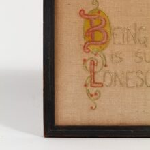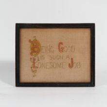 Sampler cross stitch style motto hand-sewn with the inspiring line: “Being Good is Such a Lonesome Job.” Original frame.
