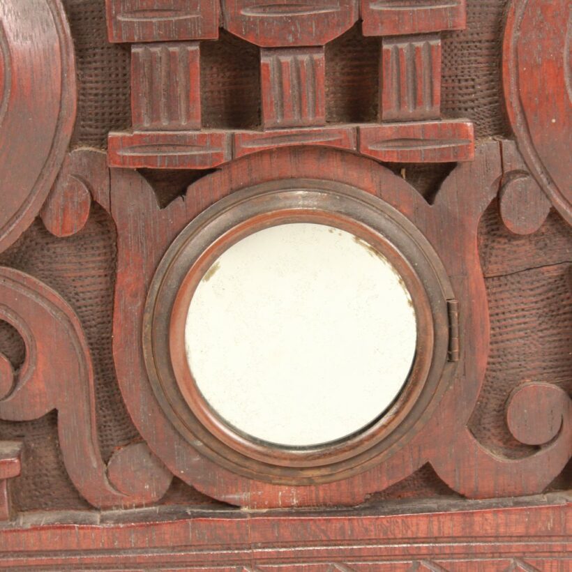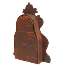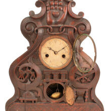 An extraordinary and rare example of Bellamy’s work, the shelf clock captures his unique artistic vision through the fraternal iconography which defined nineteenth century folk art woodcarving.