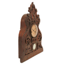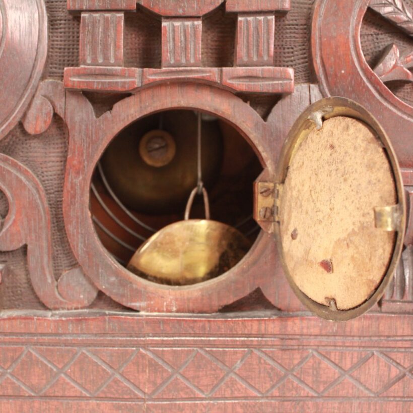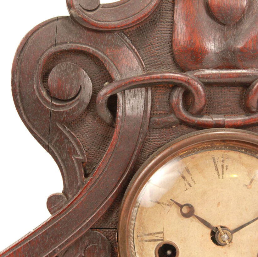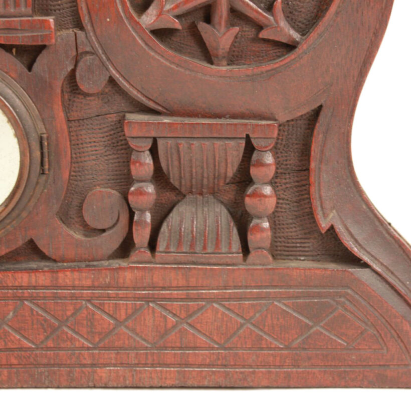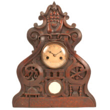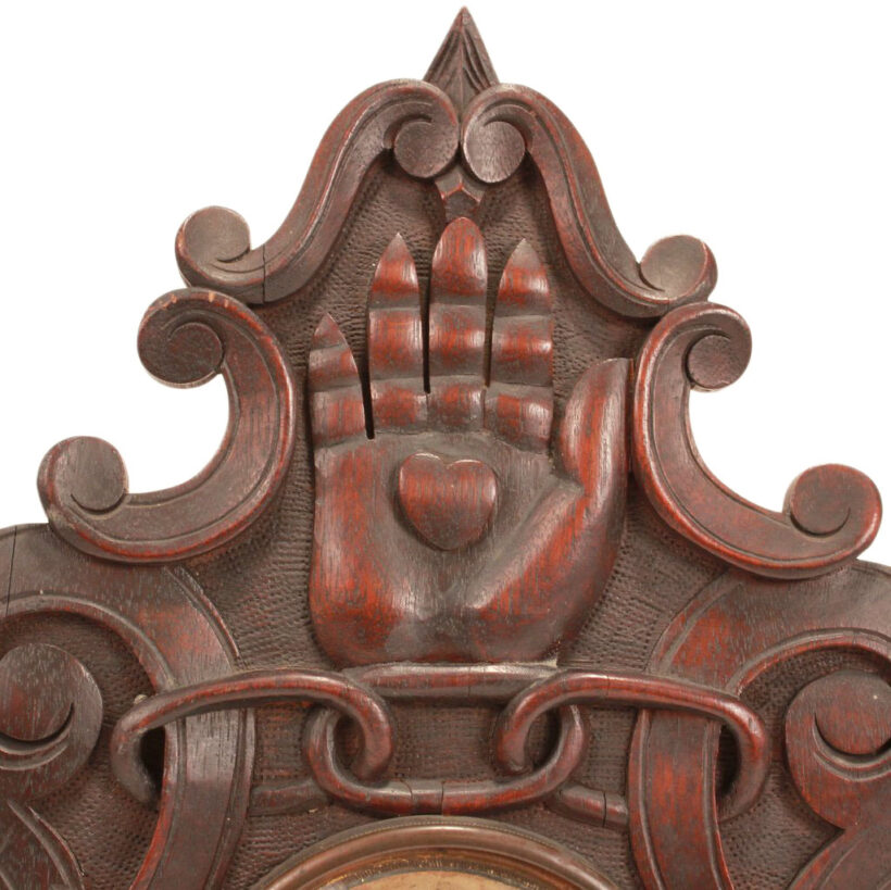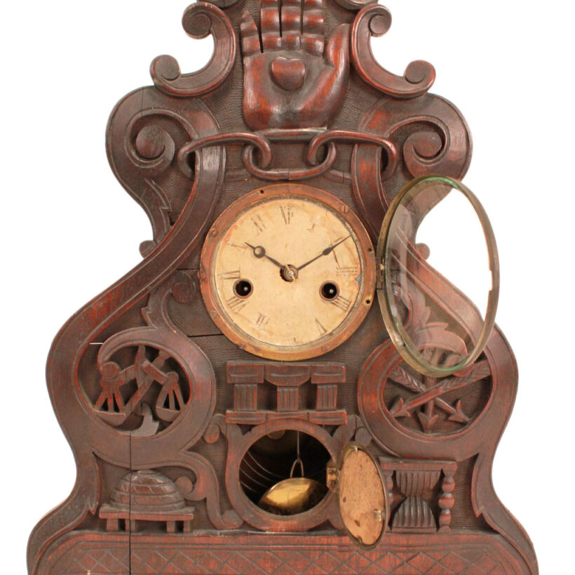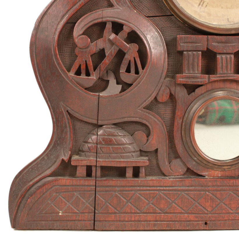 Bellamy’s hand-carved clock case features numerous Odd Fellows symbols, including the three-link chain (signifying Friendship, Love and Truth), beehive (signifying industry), scale (signifying justice), and hourglass (signifying fleeting of time). Crowning the clock is the heart in hand, which represents “cheerful giving” and benevolence to those in need.