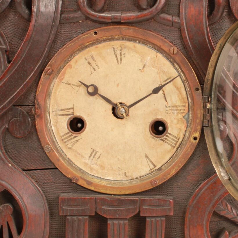 Good antique condition with a handsome aged patina. The clock case has several minor age-related splits as the wood dried and contracted over the years and a few minor chips. Perhaps in service at an Odd Fellows lodge, the clock kept time for many years, its original paper clock face showing evidence of countless windings and adjustment of hands.