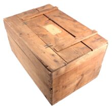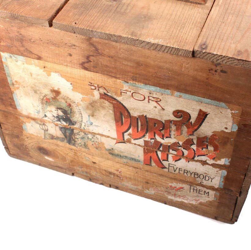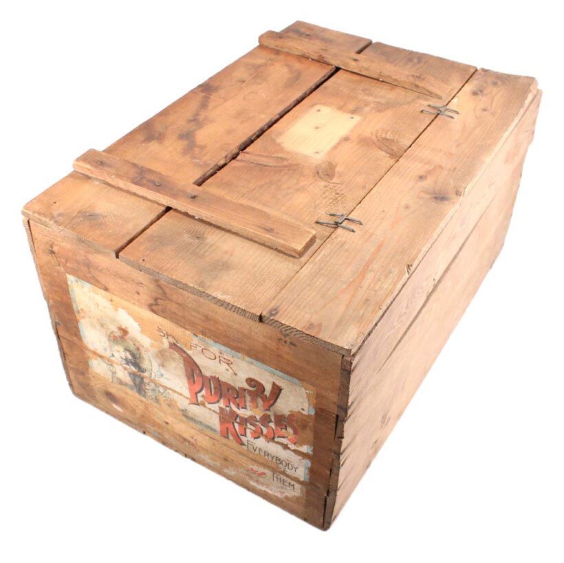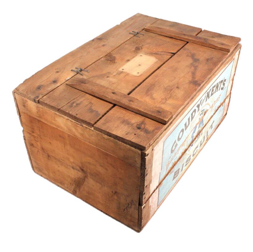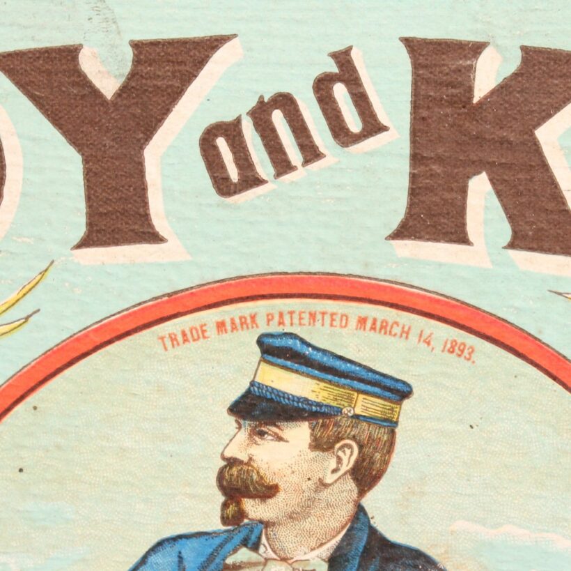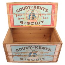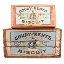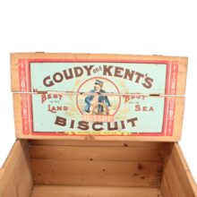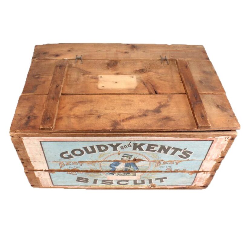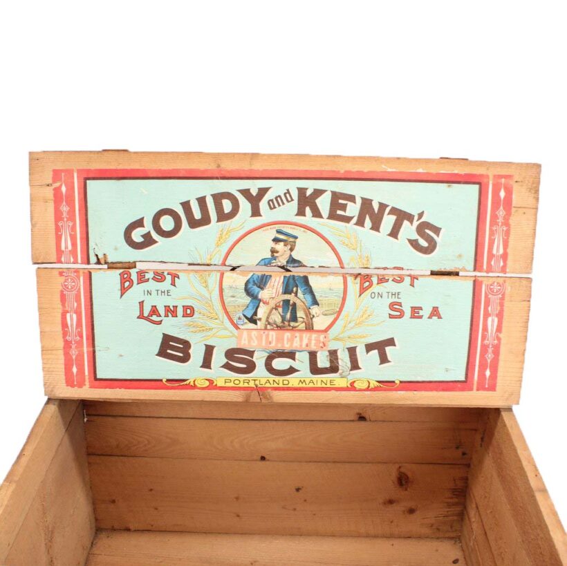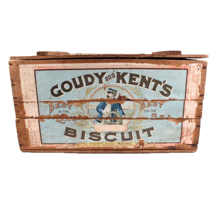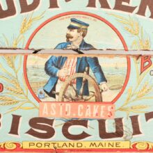 Antique Portland, Maine biscuit box with colorful nautical themed labels, c. 1890s. “Goudy and Kents Biscuit – Best on the Land – Best on the Sea.” The paper labels are in an excellent state of preservation with wonderful Victorian lettering and vibrant colors, especially the interior, from which the colorful ship captain seems to have sailed right from the lithographer. A rare Maine advertising box in remarkable condition.