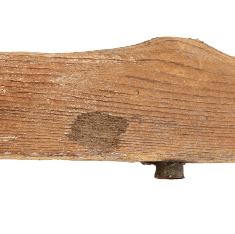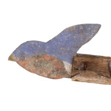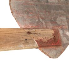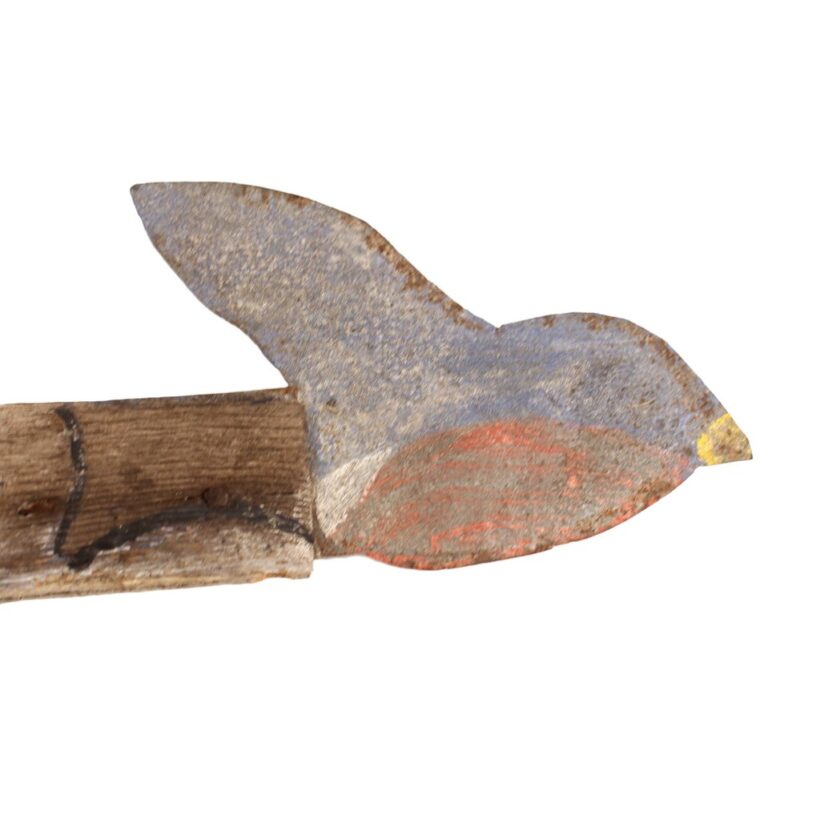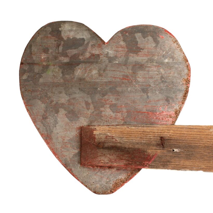 Whimsical homemade folk art weathervane with a charming subject — the “Bluebird of Happiness” perhaps? As the weathervane spins, the painted tin heart appears to follow the bluebird at its other end. However, the heart’s larger shape makes it the primary windcatcher and it in fact directs the bird. The weathervane is weighted with lead so it can spin freely in the changing breeze. I had my blacksmith make a custom iron wall mount for the piece (included).