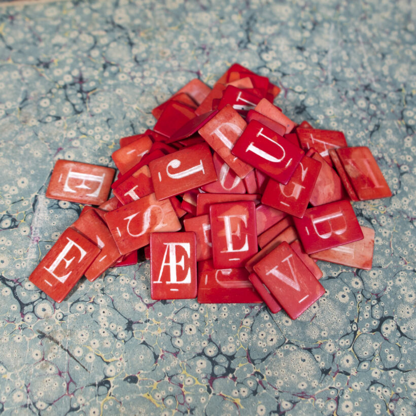 Letter game pieces / dyed & carved bone / c. first half 19th century