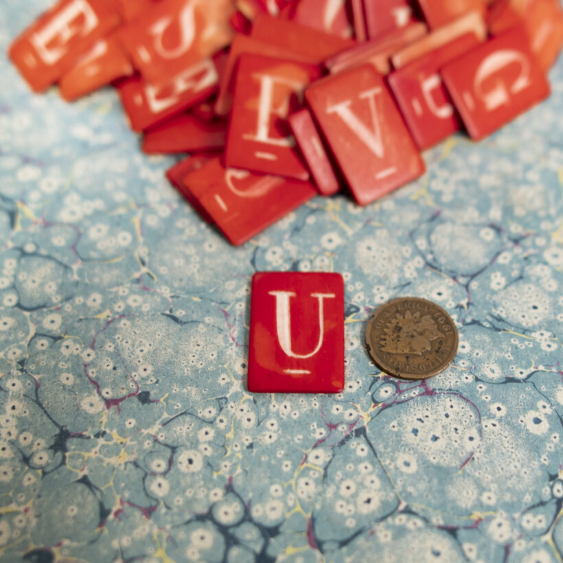 Set of dozens of early scrimshaw game pieces made from red-dyed bone with letters carved intaglio. Single-sided. Beautiful gradations of color saturation.