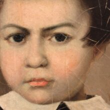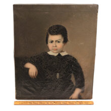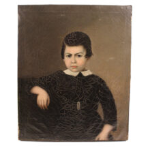 Commissioned by an American, this exceptional oil on canvas portrait of a boy was painted in China in the mid-19th century. By way daguerreotype photography, American merchants and sailors involved in the mid-19th century China Trade commissioned Chinese artists to execute portraits of their family members, though they resided on the other side of the globe in New England. Western painting styles entered China in the 18th century western artists living in Chinese ports introduced Chinese artists to European techniques. This painting’s anonymous artist was clearly a master among the Chinese painters working in the western style of painting, and his work gave life and color to an American child living thousands of miles away. Rolled canvas in hand, the artist’s American client sailed from the Chinese port have paid a lower price and — at least in this example — commissioned a better quality portrait that he could have found in New Hampshire or Cape Cod.