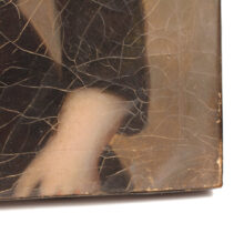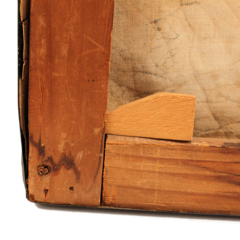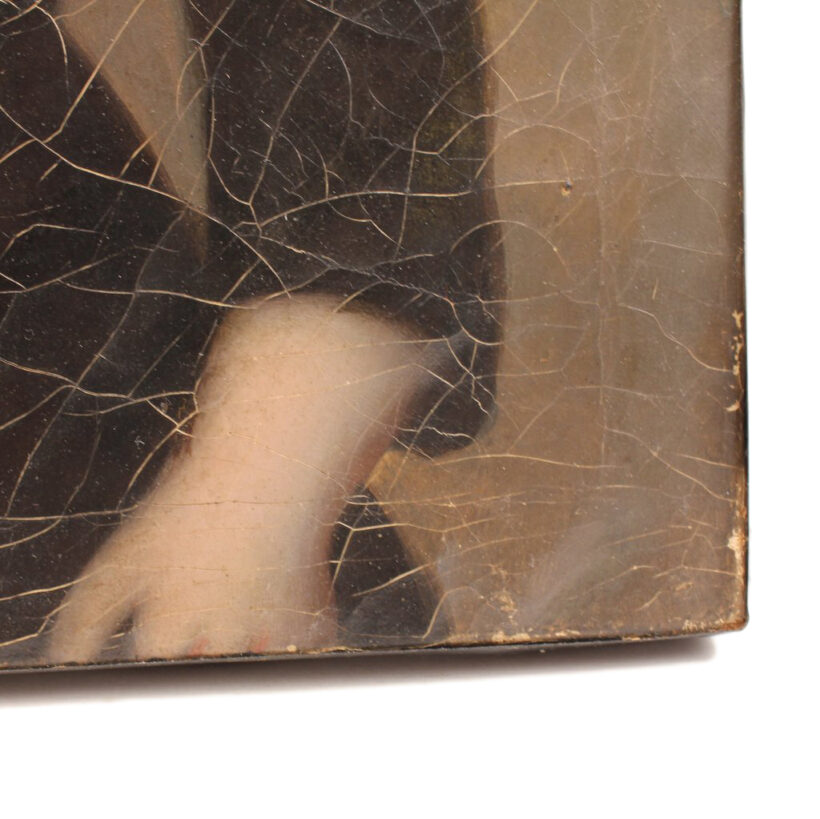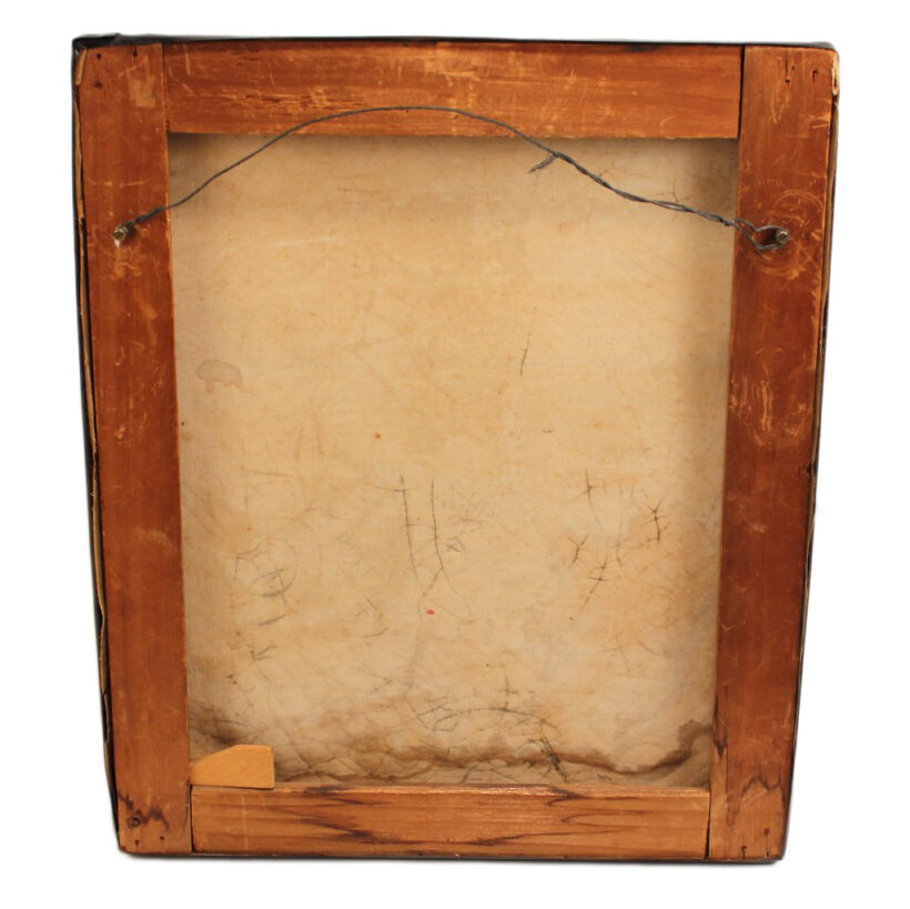 The painting’s wooden stretcher type indicates the portrait is China Trade, as well as its cracqueleur, a signature element of China Trade paintings. The tiny fissues in the surface indicative of the types of canvasses and paints used by Chinese painters, and this portrait is no exemption. The canvas has a beautiful cracqueleur, which creates an abstract textural overlay over the realistic portrait, adding complexity and depth to its moody composition and serious young subject.