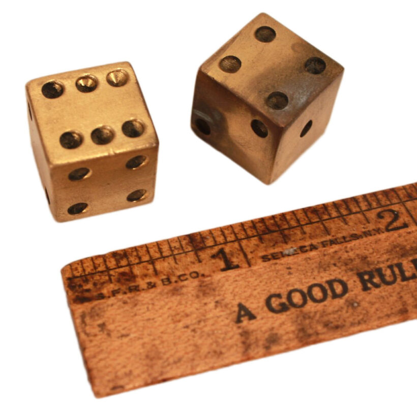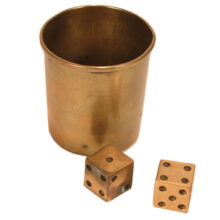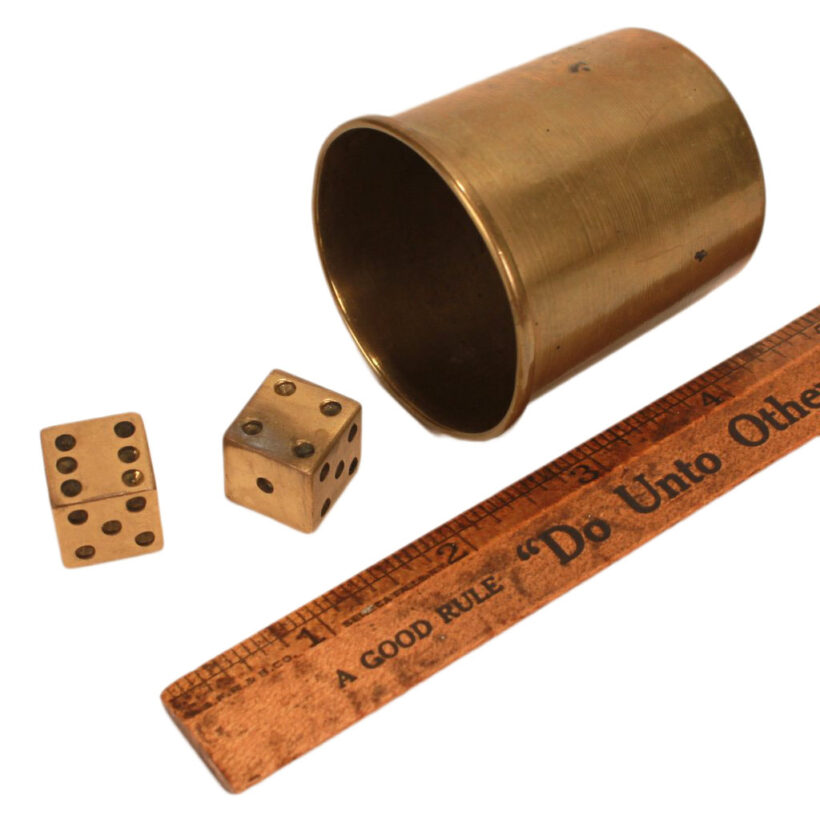 Antique handmade brass dice and rolling cup, likely machine shop folk art, c. 1930s or ’40s. The tooled dice have some serious weight — better watch where you’re rolling. Handsome old brass patina.