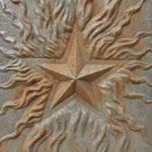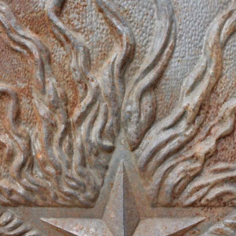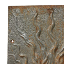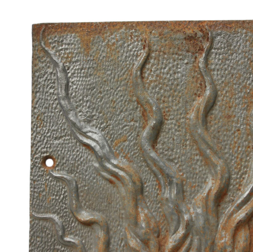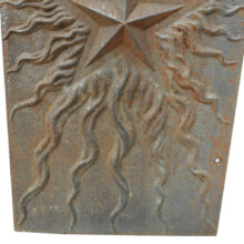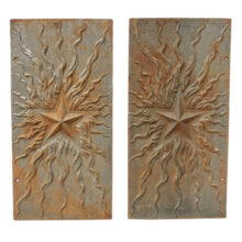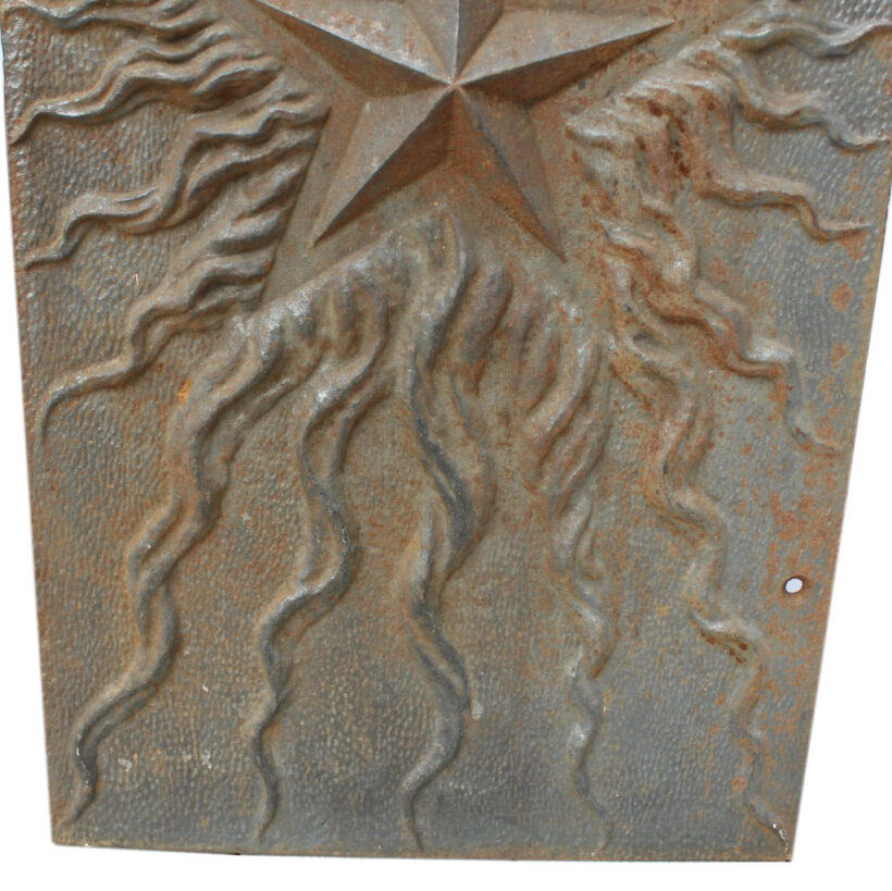 These antique Victorian cast iron panels would have been inset into either side of a fireplace interior to absorb the heat from a burning wood or coal. The identical heavy iron panels each have a central raised star surrounded with tendrils of flame cast in high relief. Liberated from the hearth, hang the artful salvaged panels on an interior or exterior wall.