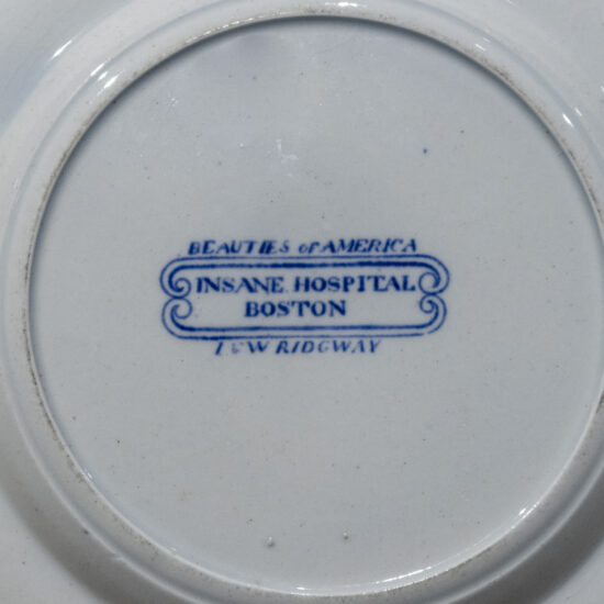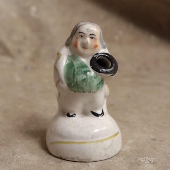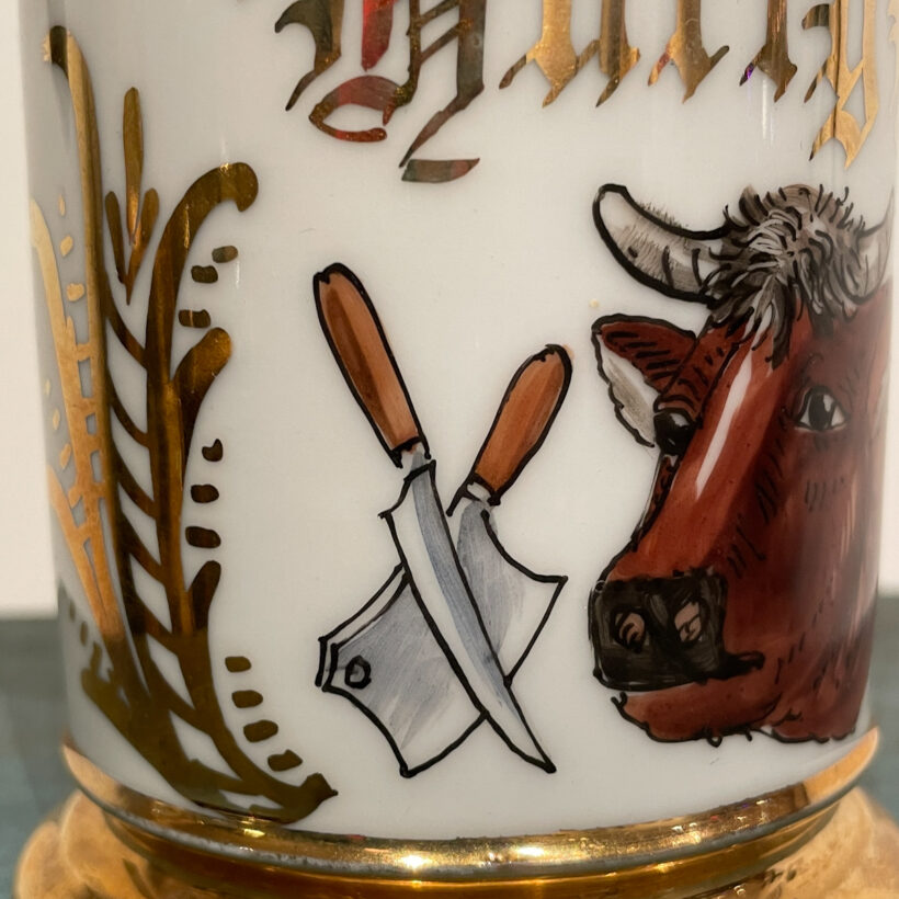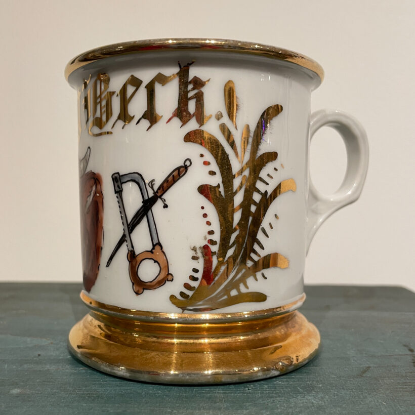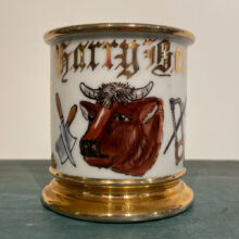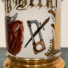 Hand-painted with steer, cleaver, and saw, this occupational shaving mug illustrated the profession of its owner, Harry Beck, a butcher.