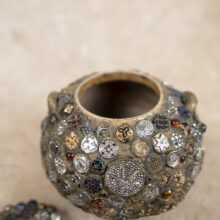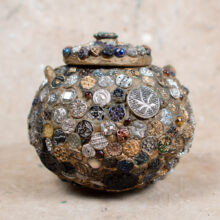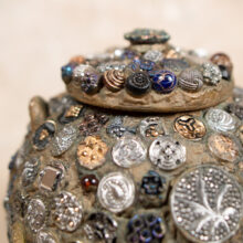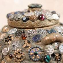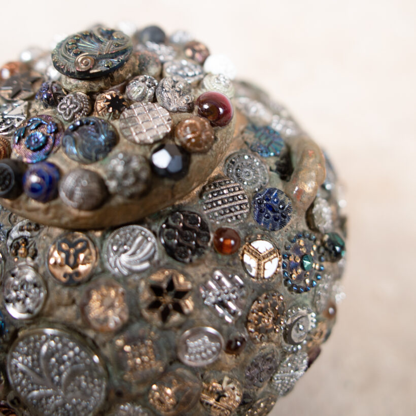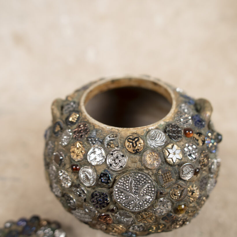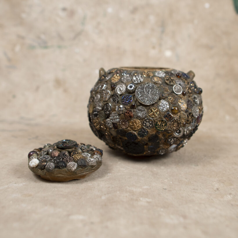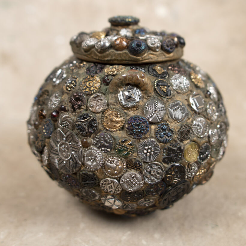 “Memory” folk art jar encrusted with hundreds of extraordinary pressed-glass Victorian buttons of all sizes, many with luminescent finishes in lurid colors. A jarring contrast between the raw and refined, the vessel is a mesmerizing pileup of sparkling pattern and rough texture.