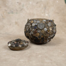 Originating in West and Central African burial practices, “Memoryware” is an American folk art with roots in the craft traditions enslaved Africans brought with them to the United States. As with so many American artistic genres, the creative influence of African-American communities shaped the national culture writ large and the “memory jug” became a folk art craft pursued around the country. Usually dating from the late nineteenth or early twentieth century, the memory object brought together bits and pieces meaningful to their makers, with some examples created to memorialize the dead.