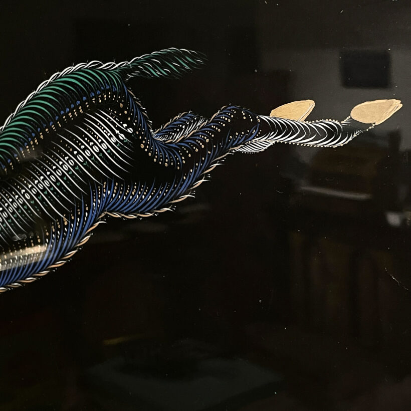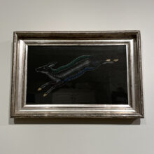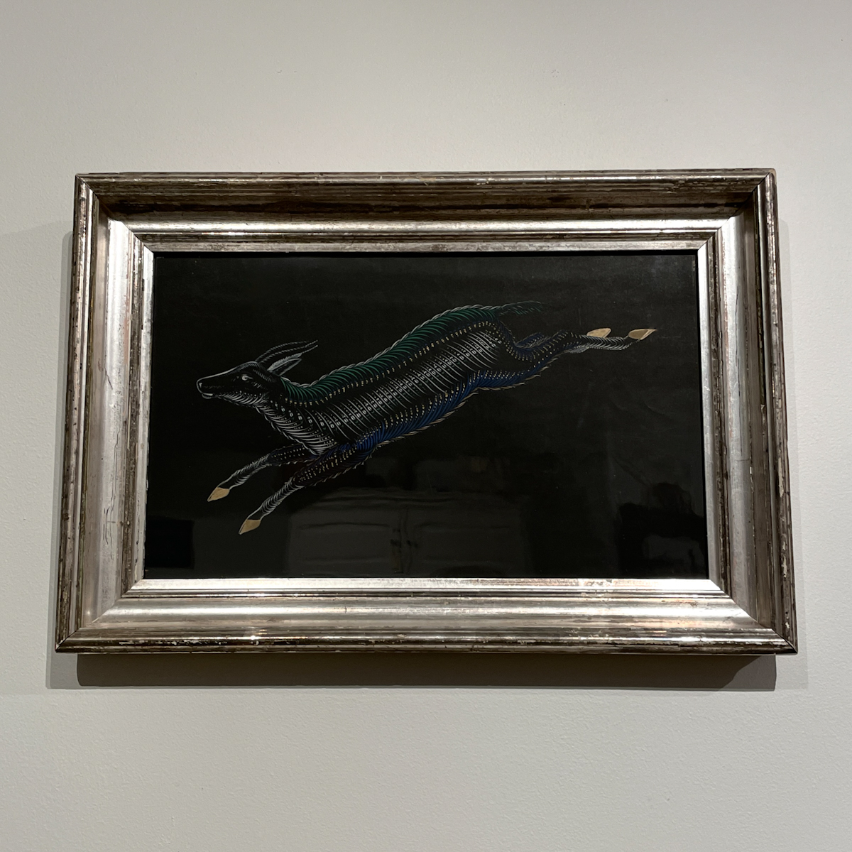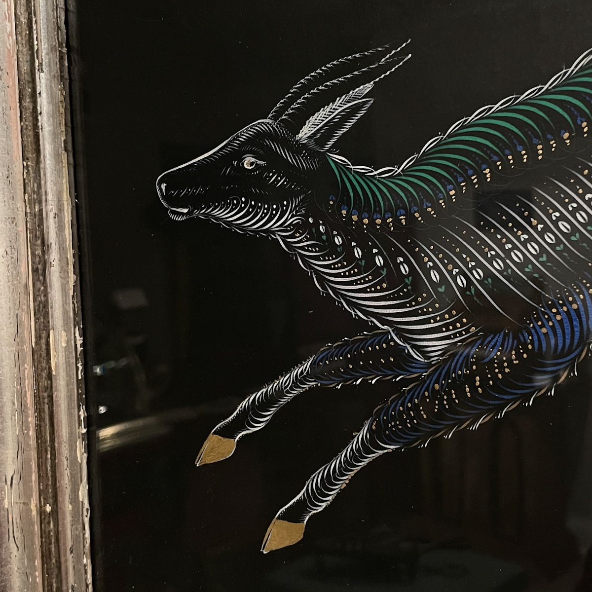 Whimsical folk art Spencerian hand-painted depiction of a goat in white and polychrome on a black ground. In person, the contrast makes the gold-hoofed goat leap off the paper. In period silver-gilt frame.