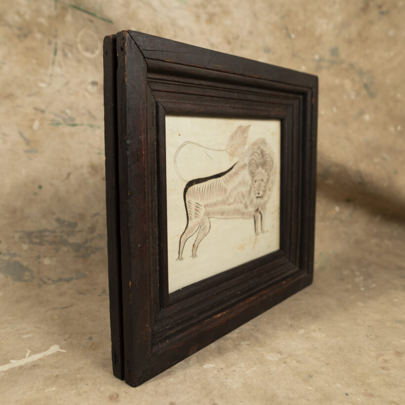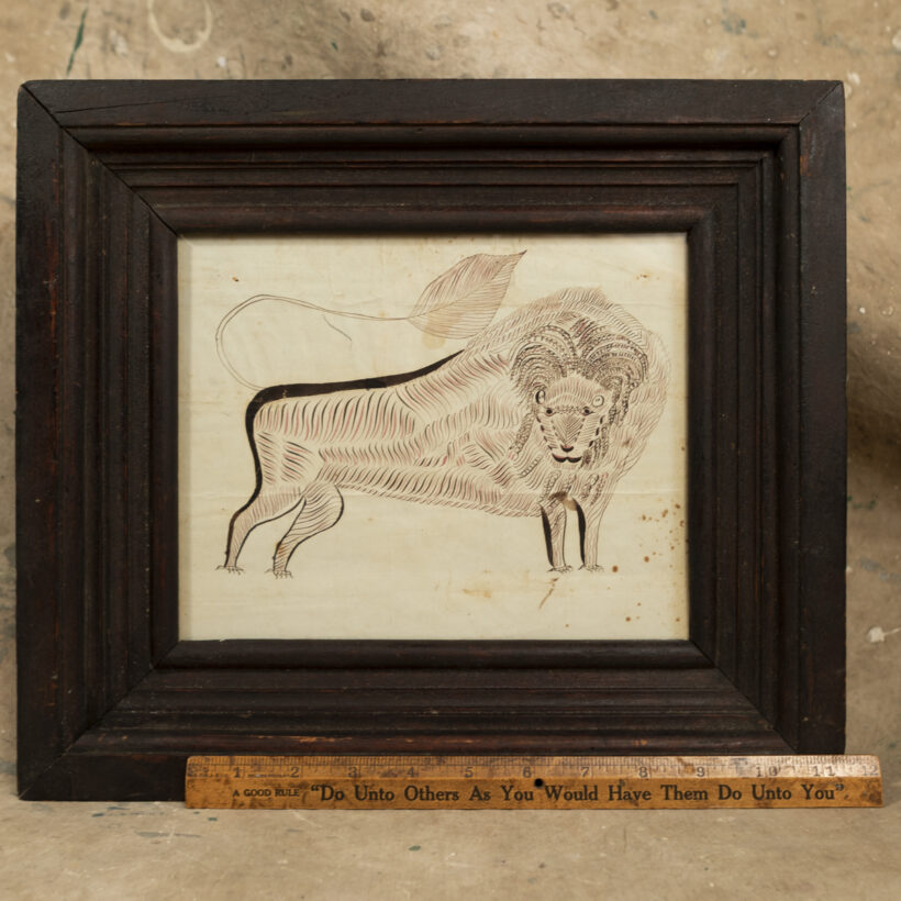 Wonderful folk art drawing of a lion in red and black ink drawn in the Spencerian style. Found in Pennsylvania. Period frame.