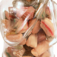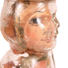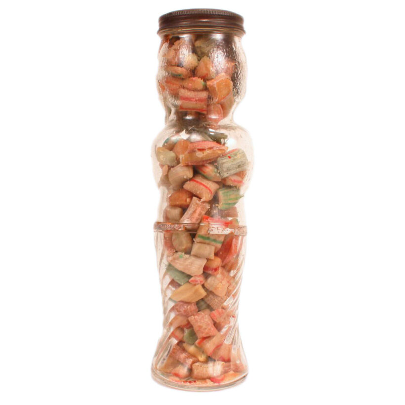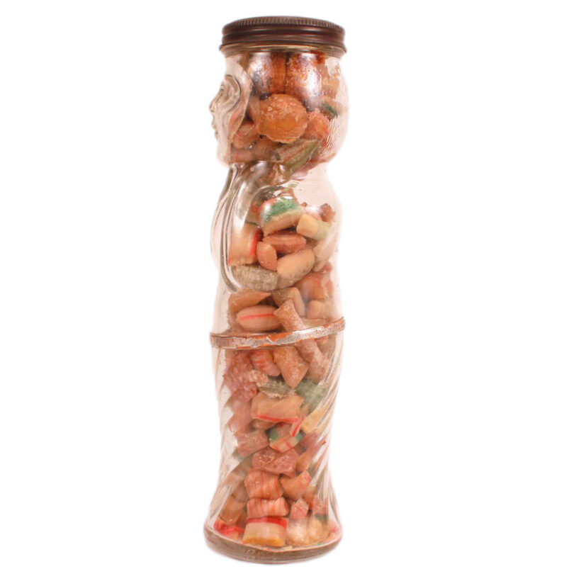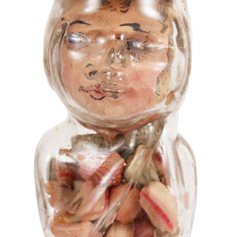 This vintage glass candy jar somehow both escaped time and sweet-toothed children, remaining untouched despite its eighty-plus years. The jar takes the shape of a woman, whose face is paper and placed on the interior of the glass. Slightly off kilter, her misplaced face and translucent skin not only give the piece an evocative, surreal quality, but also lend the object a greater unintended significance: A woman’s body transformed into candy, her person rendered invisible.