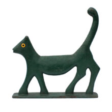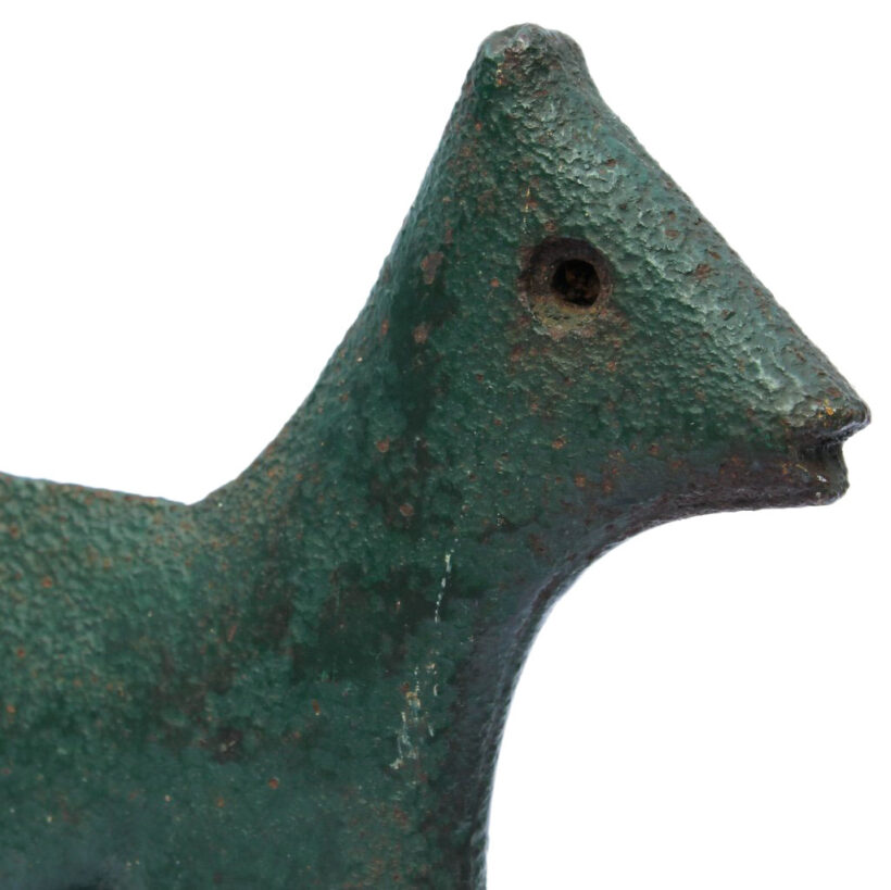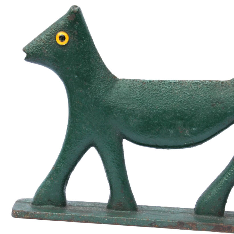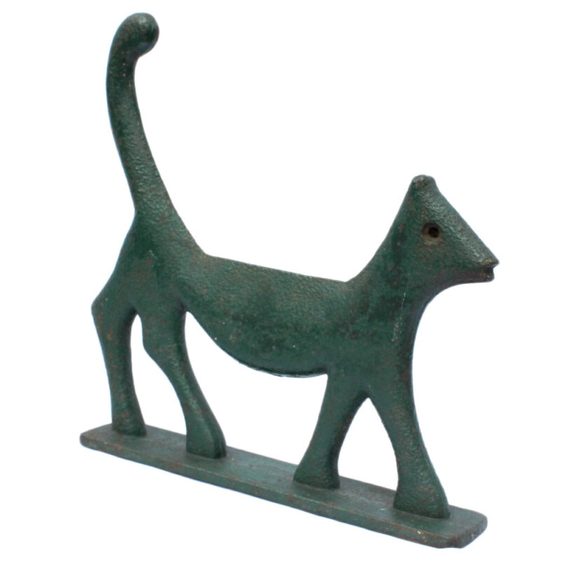 Antique cast iron door door stop and boot scraper in a stylized form of a cat, c. turn of the twentieth century. He retains one (rather startled-looking) glass eye. Great color in old green paint.