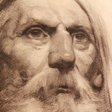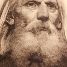 Antique original charcoal portrait of a fiery old man, c. early 20th century. Exquisitely rendered, capturing this striking character’s piercing gaze and fervent countenance, qualities heightened by his unkempt beard and uncut shoulder-length hair. Religious fanatic? Radical intellectual? The intensity of the man’s visage shows the unmistakable, unrelenting passion of the zealot, recalling portraits such as that of abolitionist John Brown.