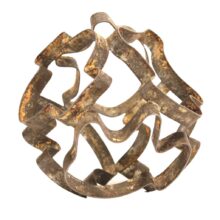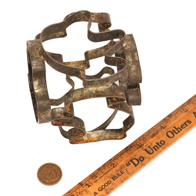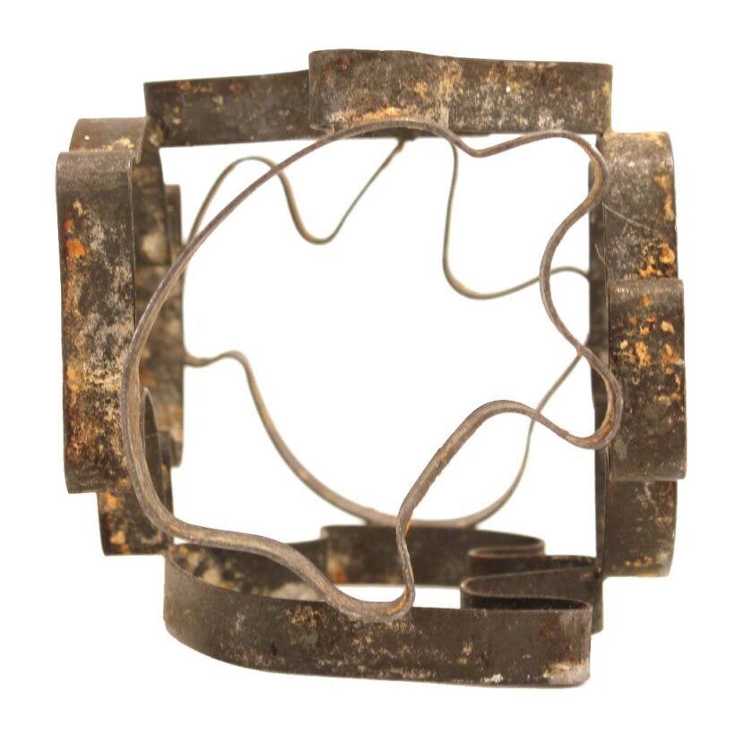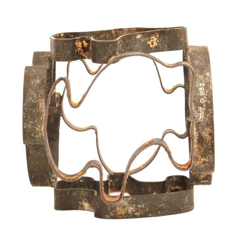 Four-sided tin cookie cutter with animal shapes, c. 1930s. Unusual cookie cutter in a strikingly sculptural cube form. Each side has a different animal cutout: bunny, pig, sheep, and so on. The cube is cage-like, but its constraints are external, demarcating the shapes of what it creates. Patent number dates it to 1934.
