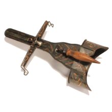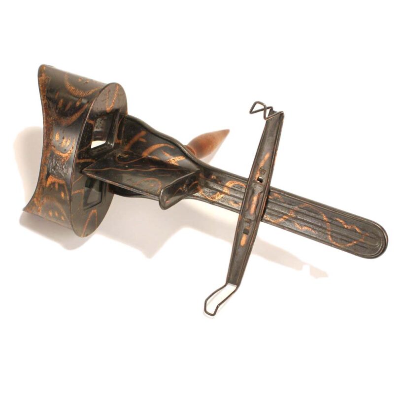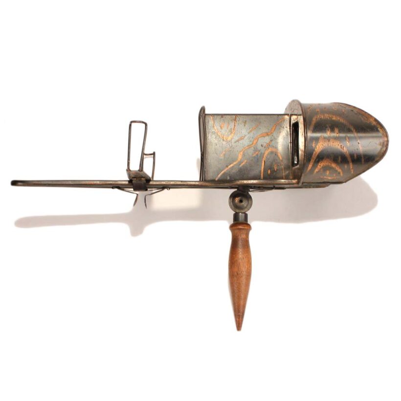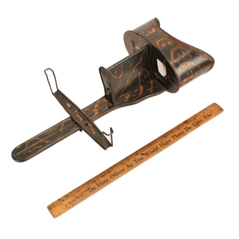 For your three-dimensional stereoviewing pleasure, an antique stereoscope viewer in a rare japanned copper flash finish, c. 1900. Stamped “The Perfecscope” and retailed by the H.C. White Company. Bold copper flashing upside and down. Folding wooden handle. Excellent optics. A useful viewer for antique stereoview cards, but a sculptural object in its own right.