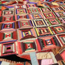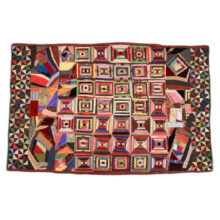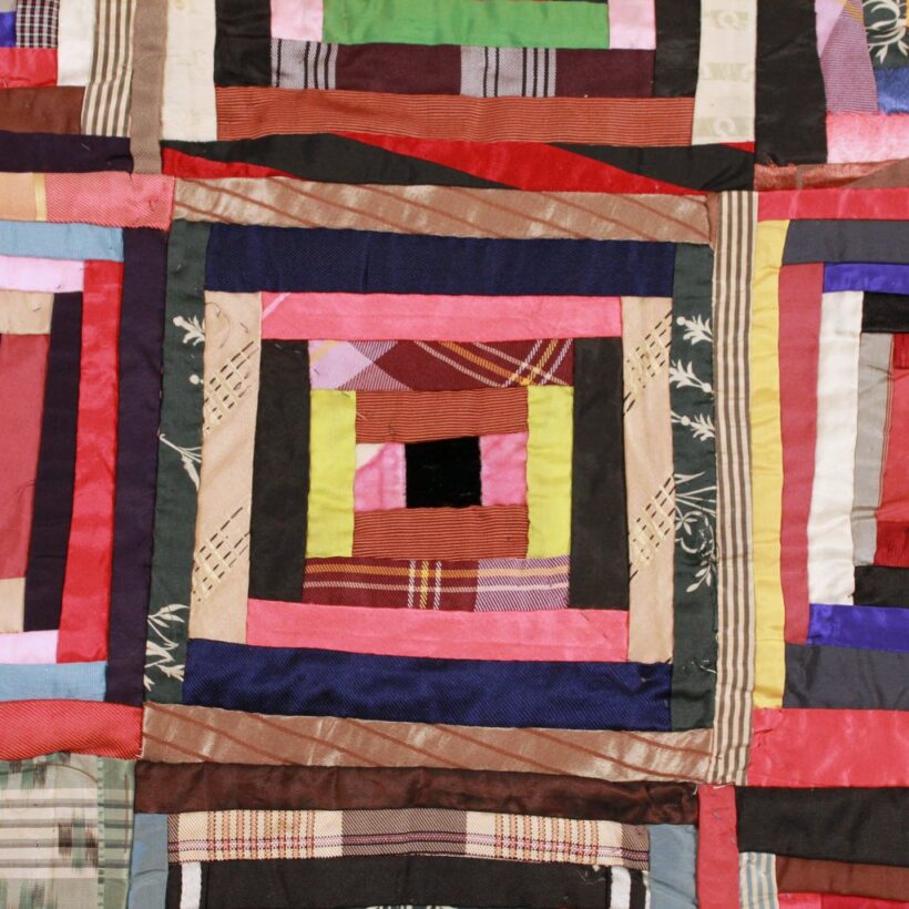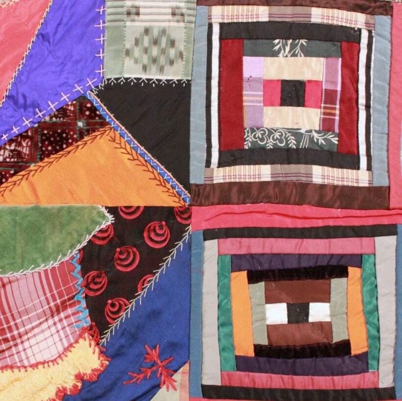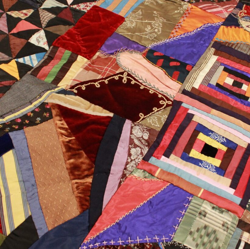 Antique crazy quilt, c. 1880s. Hand-sewn from hundreds of pieces of scrap silk and velvet fabric, salvaged from dresses and neckties. The folk art quilt is unusual for its combination of patterned and random fabric-placement. It is fitted with fabric eyelets on the reverse for hanging on the wall. The textile has a strikingly contemporary feel with bold, vibrant colors.