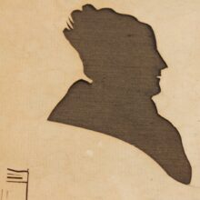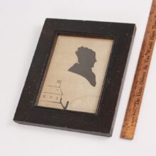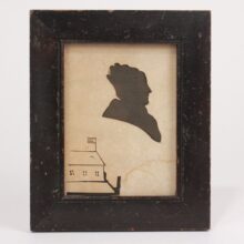 This mid-nineteenth century folk art cut paper silhouette is unusual in that it includes a structure, almost certainly representing a schoolhouse, with the American flag flying overhead. The imposing silhouette of an older woman floats above, likely representing the schoolmistress. Tiny in comparison to the cut profile of the teacher, the schoolhouse is surmounted by the shadow of its master, who looms in the sky above like a black cloud.