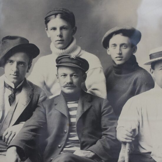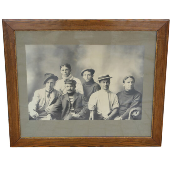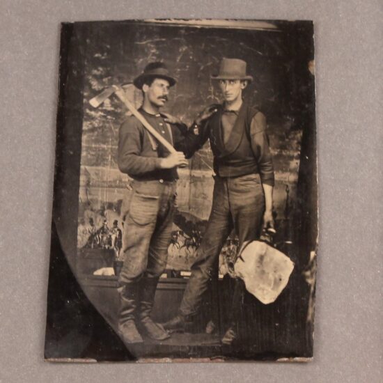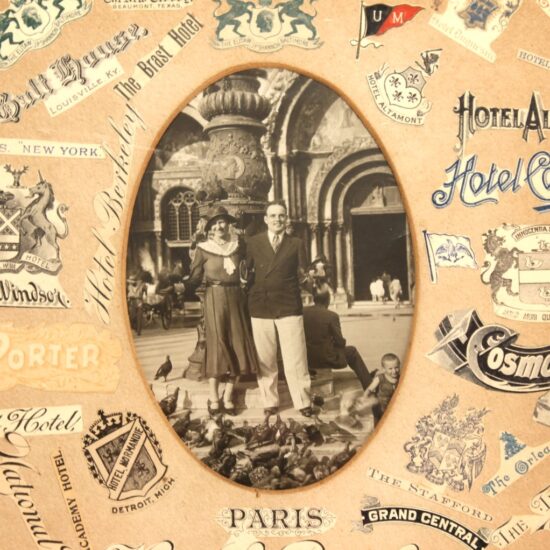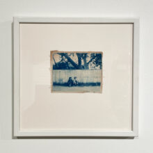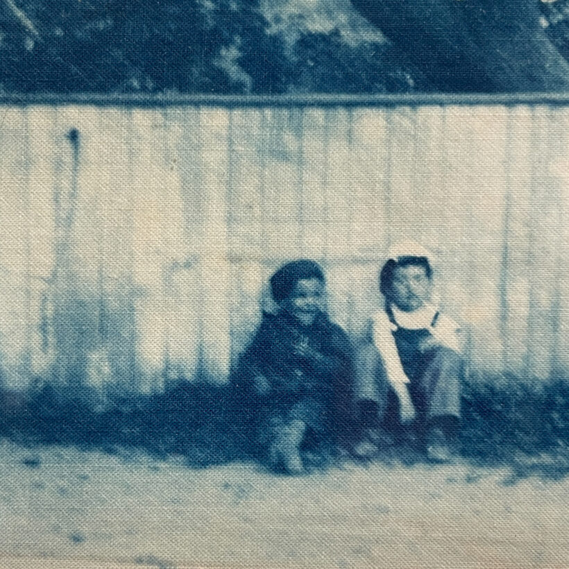 Depicting a candid scene of two kids sitting along a fence, this unusual cyanotype was developed on cotton fabric. One of the first forms of photography, cyanotypes produce a distinctive blue-colored print.