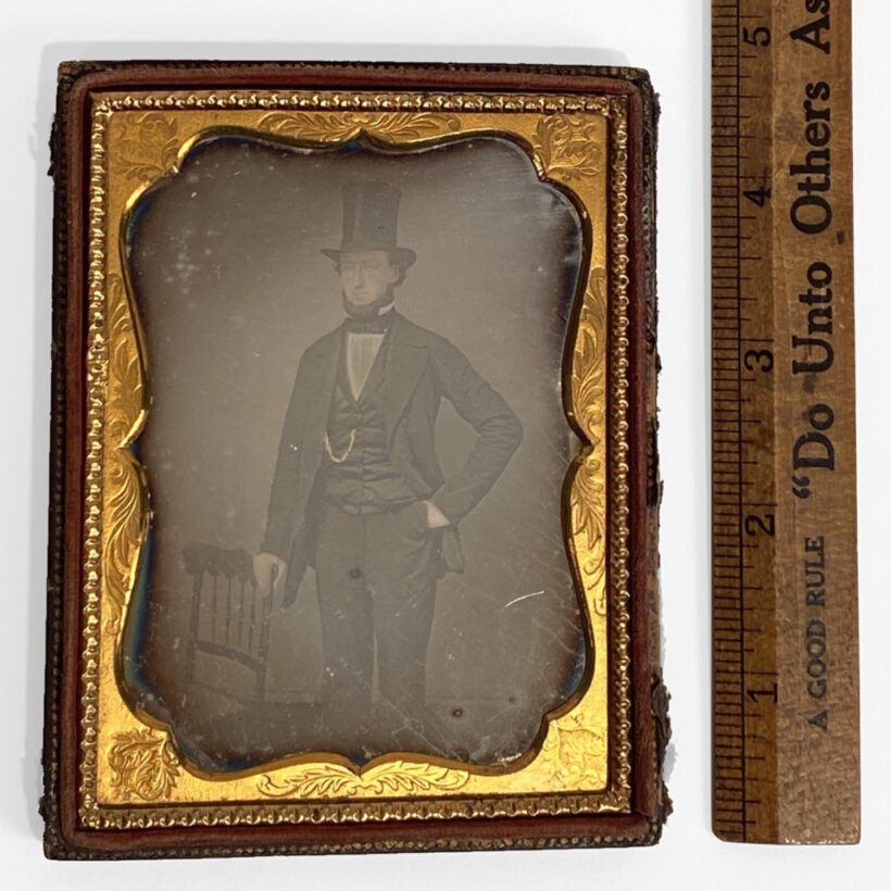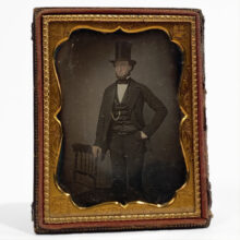 Fine quarter-plate daguerreotype portrait of a gentleman wearing a stovepipe top hat, c. 1850s.