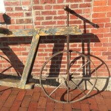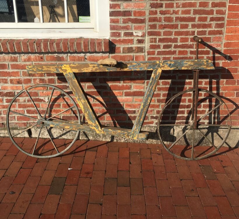 Rare and important American “dandy horse” pedestrian-driven velocipede, New England, c. early 1820s. The forerunner to the bicycle, this curious kick-propulsion two-wheeler is a uniquely American interpretation of the velocipede, an invention which for a brief time garnered fascination and scorn across the United States. Historians estimate no more than one hundred American velocipedes ever rolled the nation’s streets, and in this singular example we find an American vernacular version of the short-lived “mechanical horse.”