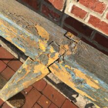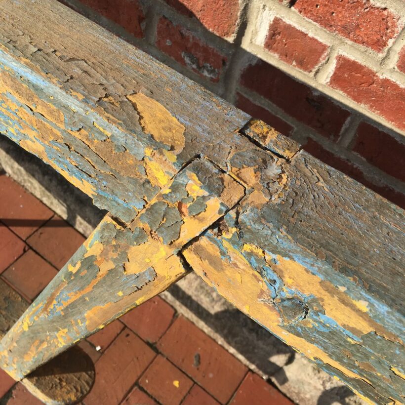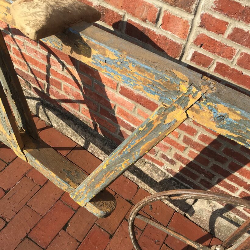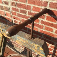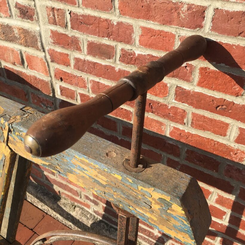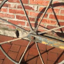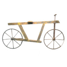 Found in Vermont, this extraordinary proto-bicycle stands apart for its striking form which is at once primitive and refined. Given the ungainly elegance of velocipedes in Europe and later in American cities, in all likelihood this stark, unadorned design was conceived by a country carriage maker or wheelwright who saw an image of the curious vehicle in a newspaper. His creation has a wood-pegged mortice and tenon frame in old blue and yellow paint, wood-spoked wheels with iron rims, and a wrought-iron front fork driven by brass-riveted turned wooden handles. The seat is upholstered, and though stuffed with ample horsehair, a rider would have felt more than minor discomfort rolling down a cobblestoned street. With its angular frame, clean lines, and functional design, the aesthetic of this country velocipede is not only fresh to the modern eye, but even futuristic, anticipating bold Constructivist forms by a century.