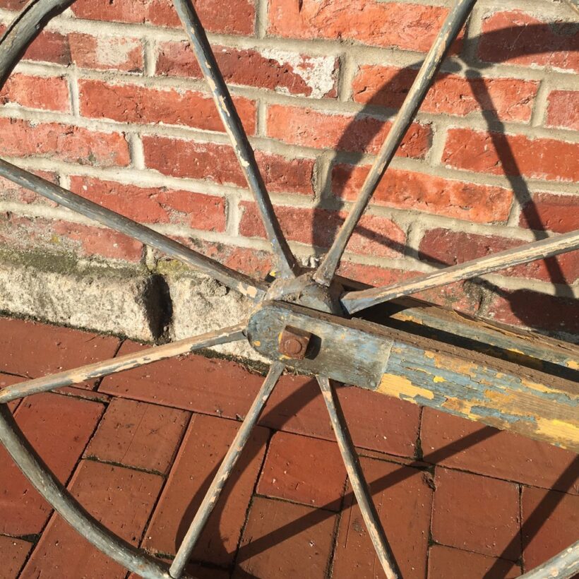 Handsome timeworn condition with an untouched surface. The wheels are fragile and the front is missing a spoke and piece of the felloes (the wooden outer rim). Otherwise, the piece is complete and all-original.
