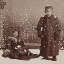 Wintry cabinet card of two children bundled up for an artificial blizzard as rendered in the darkroom. To achieve the illusion of polkadot precipitation in the studio, the photographer altered the glass negative with hand-painted snowflakes, creating a simulated winter wonderland.