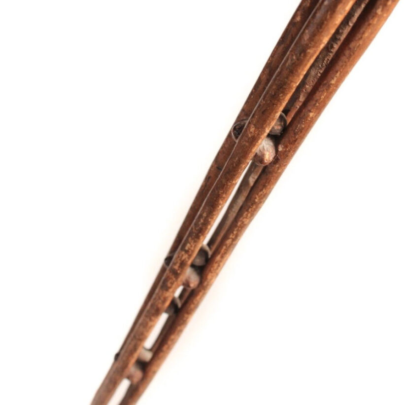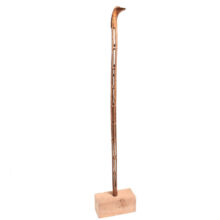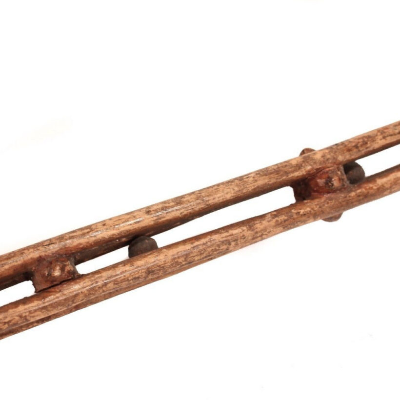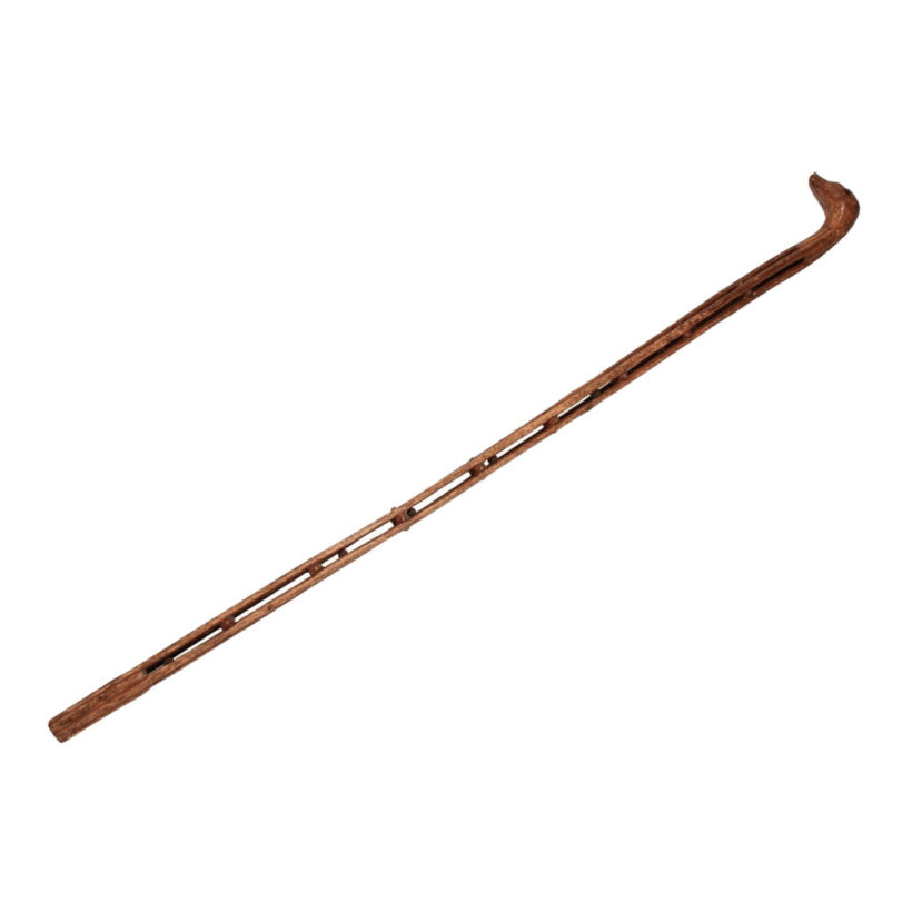 Antique Folk Art hand-carved whimsy cane with dog’s head handle and carved shaft of stacked rolling balls, c. late 19th century. Certainly the most charming and fun antique cane I’ve had. Apparently made from a single piece of wood, each carved out compartment contains a wooden ball. When moved from side to side or flipped over, the balls roll. The head of the cane – carved in a natural bend in the wood – is an exquisite naive carving of a dog’s head, with ears back, looking slightly guilty. The piece has a handsome antique patina, and based on the estate in which it was uncovered, probably dates to the late 19th century. Overall good condition, with surface wear and one missing ball. Includes simple stand for display if the buyer wishes. Found in Bucks County, PA.