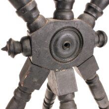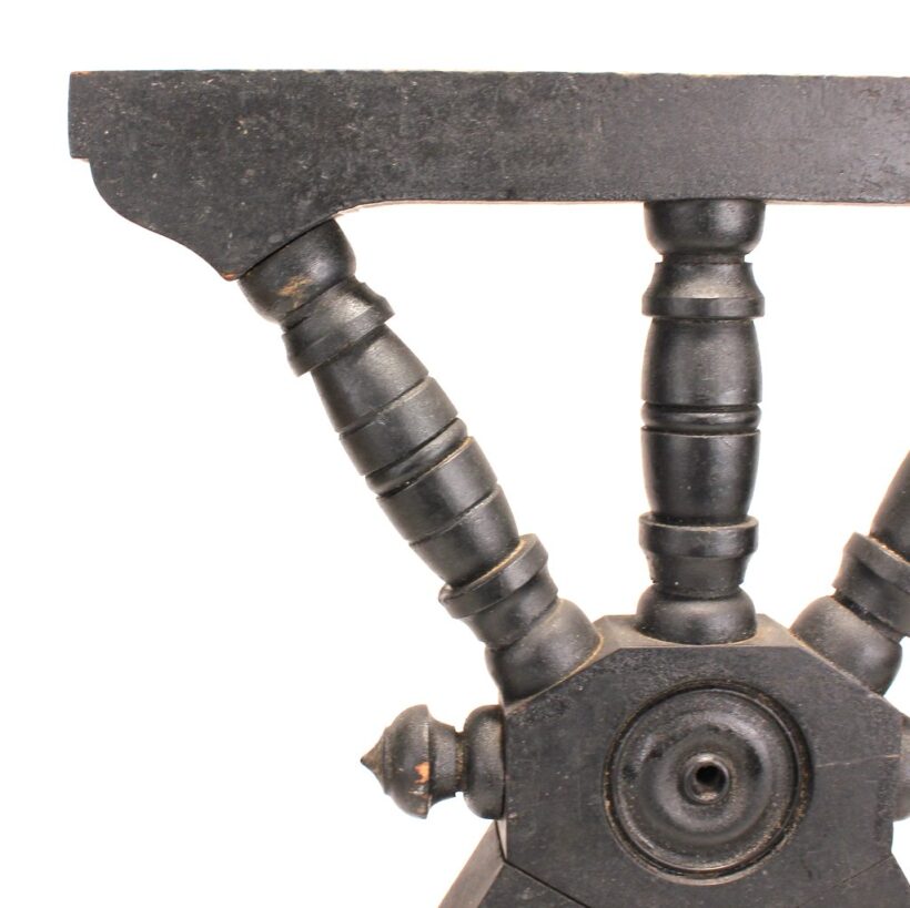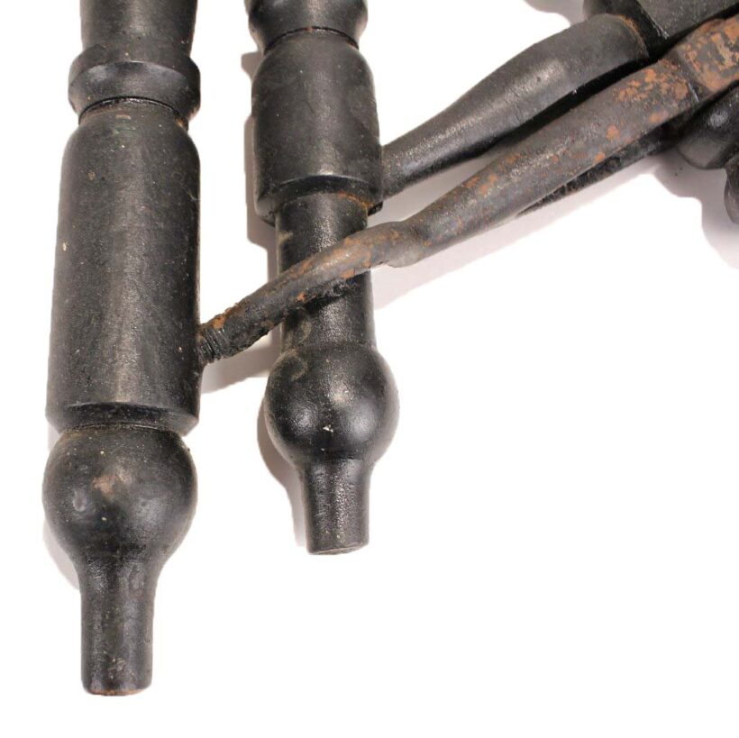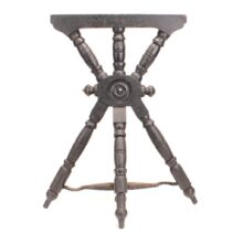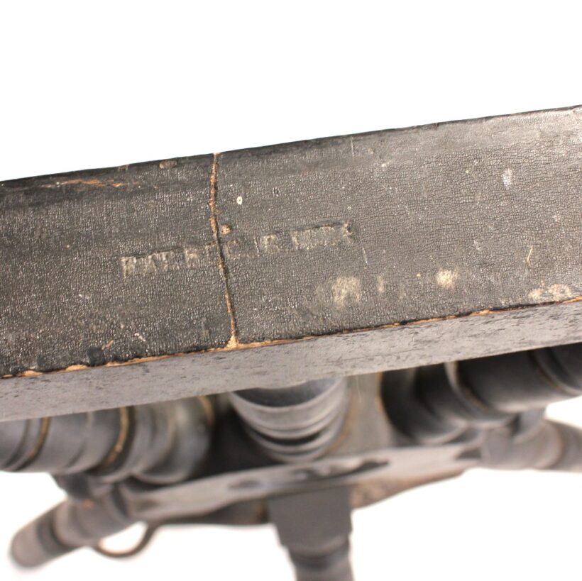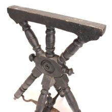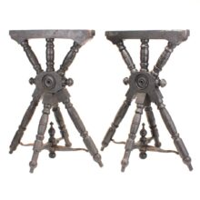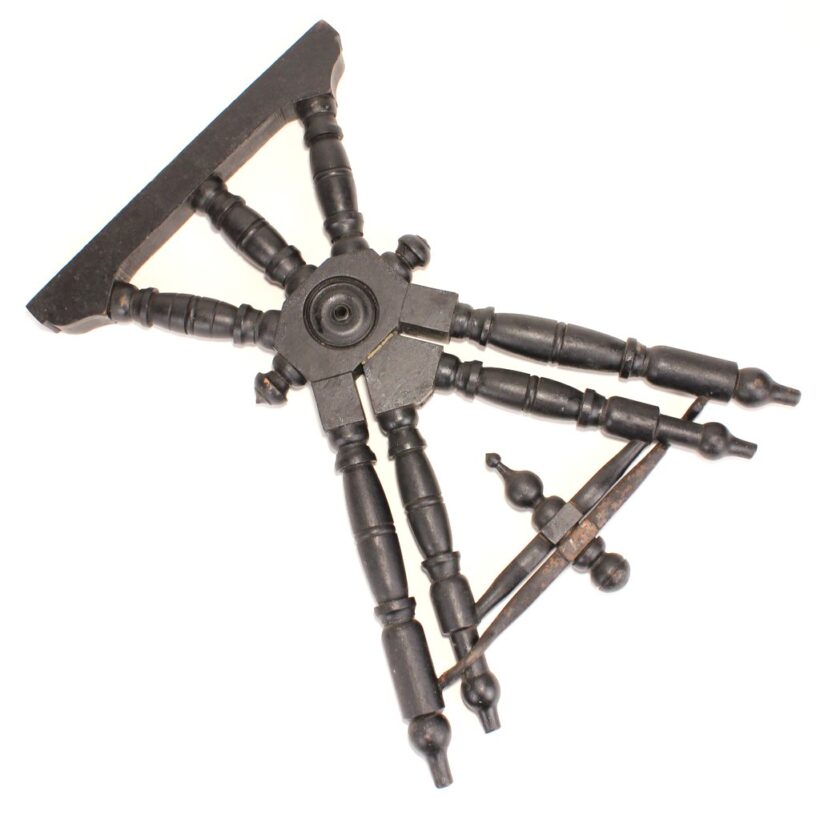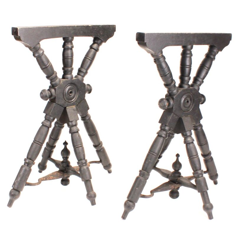 Antique Victorian folding ebonised coffin stands, c. 1880s. Inventive and functional design with handsome turnings. A pair of the legs are hinged, which turn to fold flat. Cast iron stretchers ensure sturdiness. Stamped with an 1884 patent date. With a glass or wood top, they would make a perfect (if macabre) coffee table base.