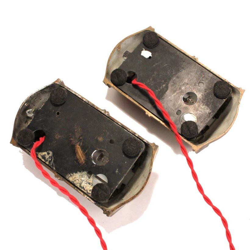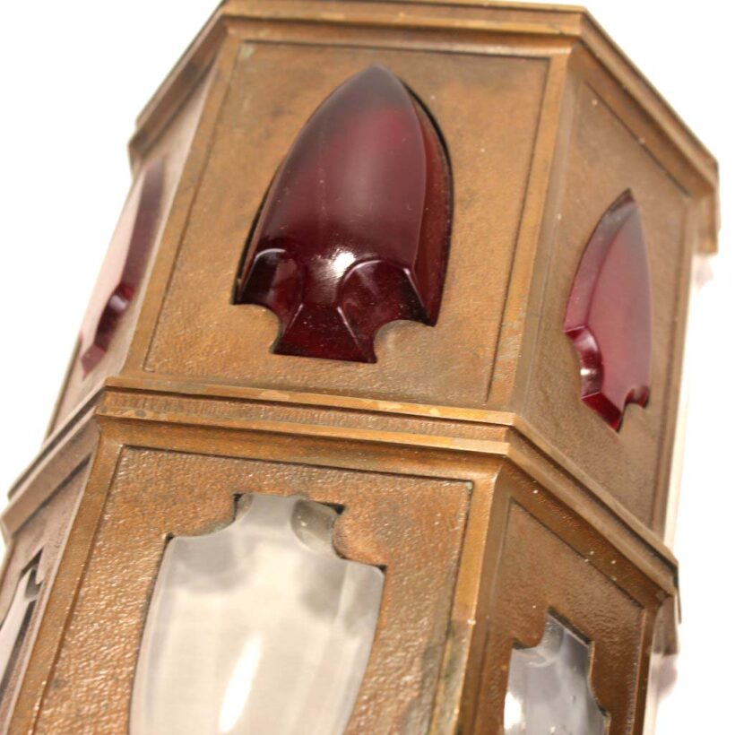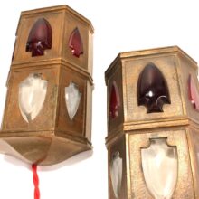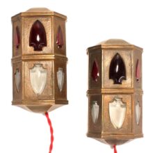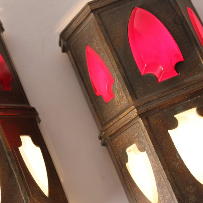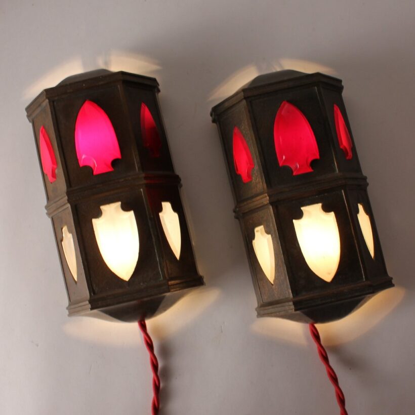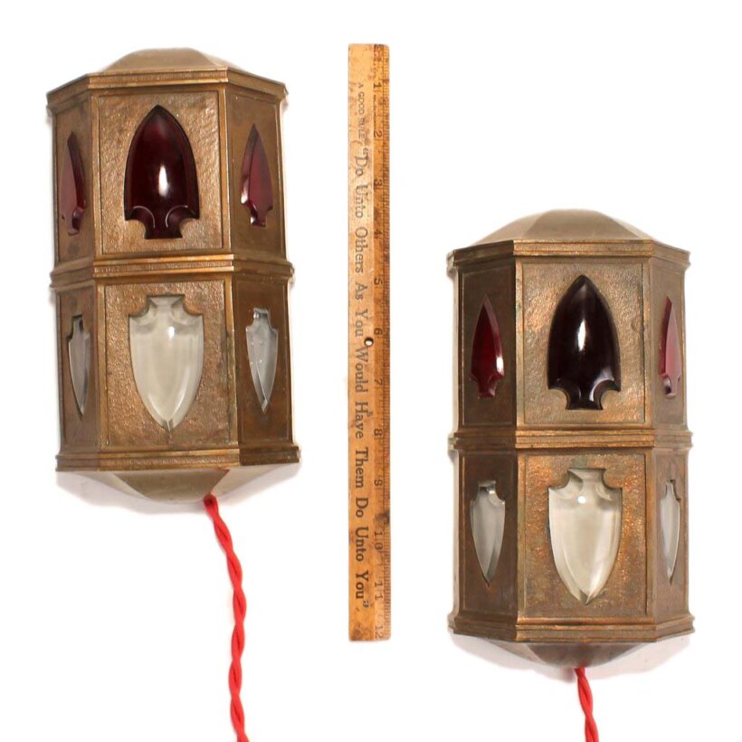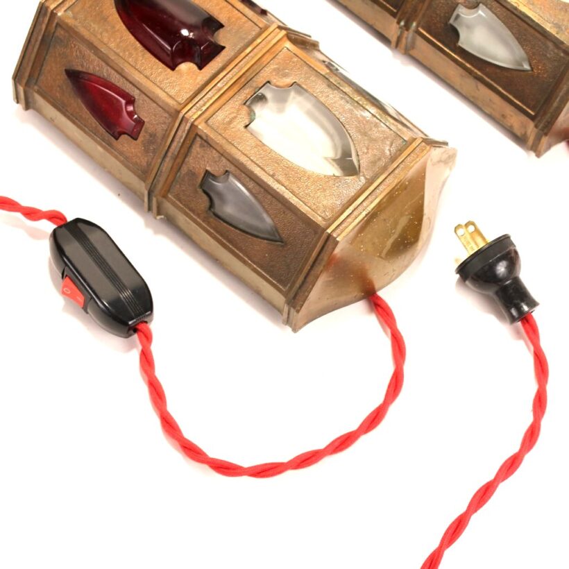 Antique bronze illuminated elevator directionals, c. 1920s. The early Art Deco style bronze fixtures would have flanked elevator doors. The stylized up and down arrows are molded from thick, sculptural colored and frosted glass. I had them rewired as wall-mounted sconces using red reproduction cloth-covered cord with old school toggle switches, but they could easily be hard wired into a wall as they were originally. The directionals give off a pleasing warm light, and would be unique nightlights in a bedroom or sconces flanking a bar. I was told they originated from a New York City skyscraper.