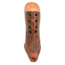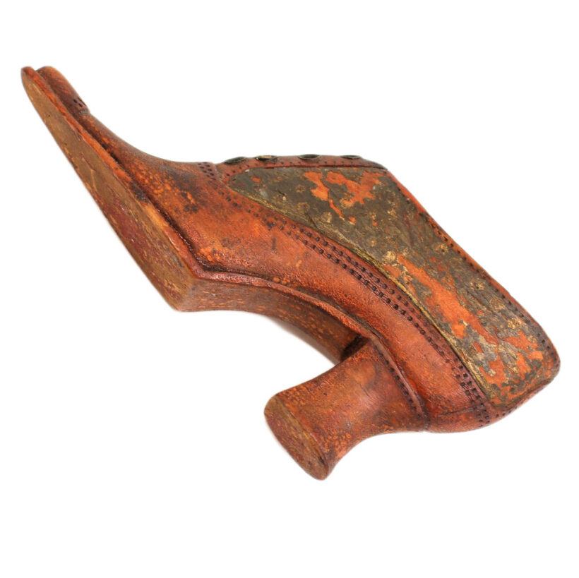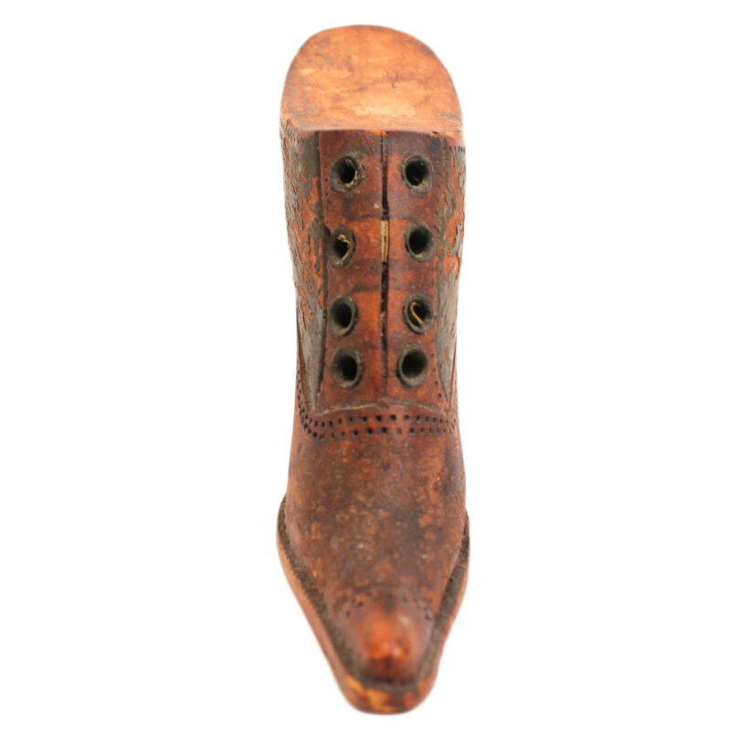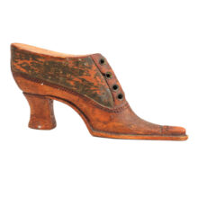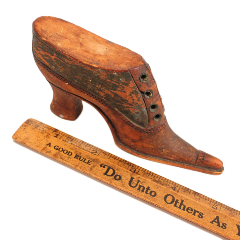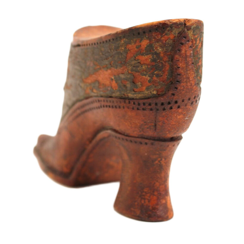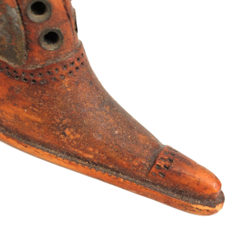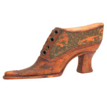Exquisite folk art carving of a miniature Victorian lady’s shoe, c. 1880s. Beautiful antique patina and charmingly eccentric form, with exaggerated features such as the impossibly pointy toe and elongated sloping heel. Detailed down to the stitching and brass shoelace eyelets. A wonderful piece of late 19th century folk art sculpture.