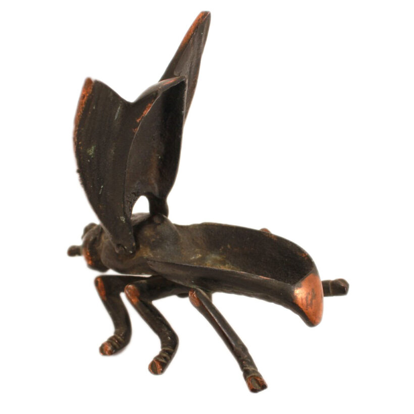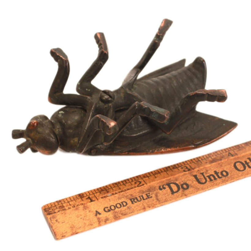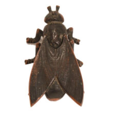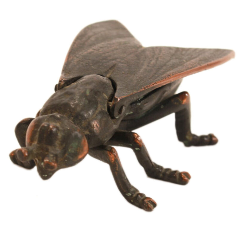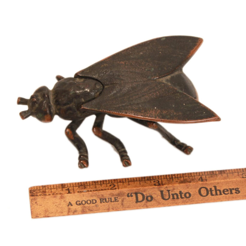 Antique cast iron tabletop match safe in the form of an unnervingly large fly, c. 1900. The wings tilt upright on a hinge to reveal the match compartment. Japanned copper flash surface. Excellent quality casting.
