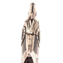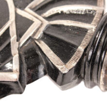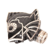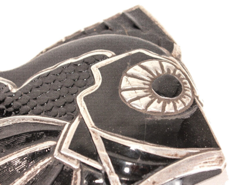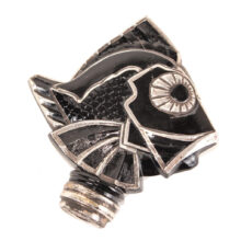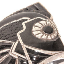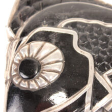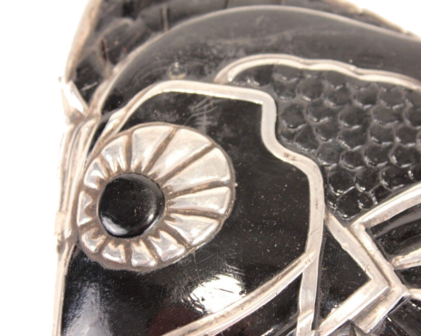 Art Deco black glass and sterling silver figural radiator mascot in the form of a tropical fish c. 1920s. Based on the materials and design, I believe the piece is French and recalls designs by Rene Lalique. The hood ornament is rare or perhaps one of a kind – I could not find another example of the form. Sculpted from black glass, the details of the fish are brought to light with sterling silver appliqué. Although in very good condition, the hood ornament was certainly used, and I can just imagine this fish swimming along atop the radiator of a Hispano-Suiza motoring to Monte Carlo. The design captures the bold geometric and angular elements which reflect the best examples of Art Deco design in the Machine Age and the tropical fish would make a unique addition to a collection of antique car mascots.