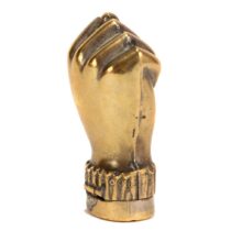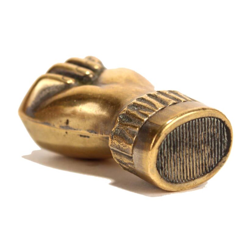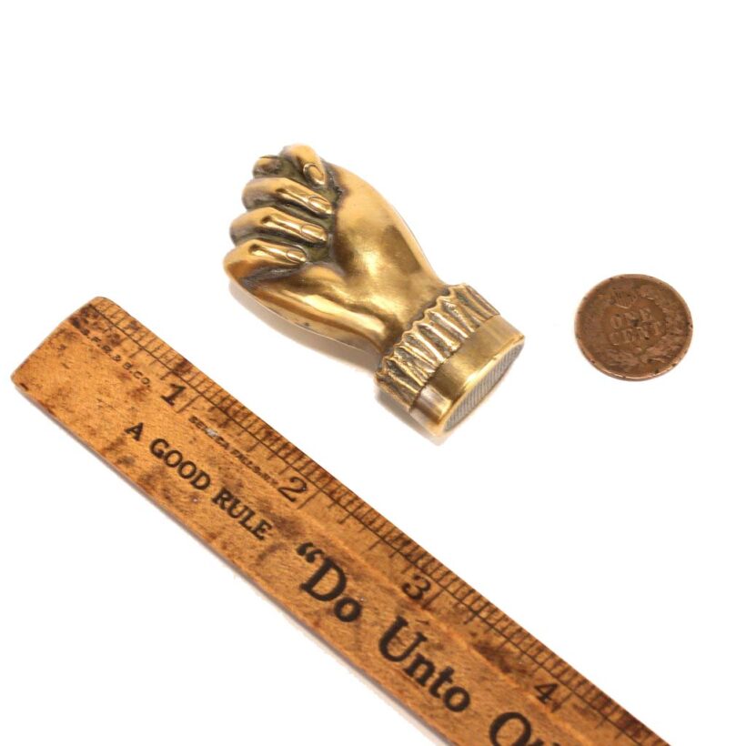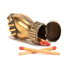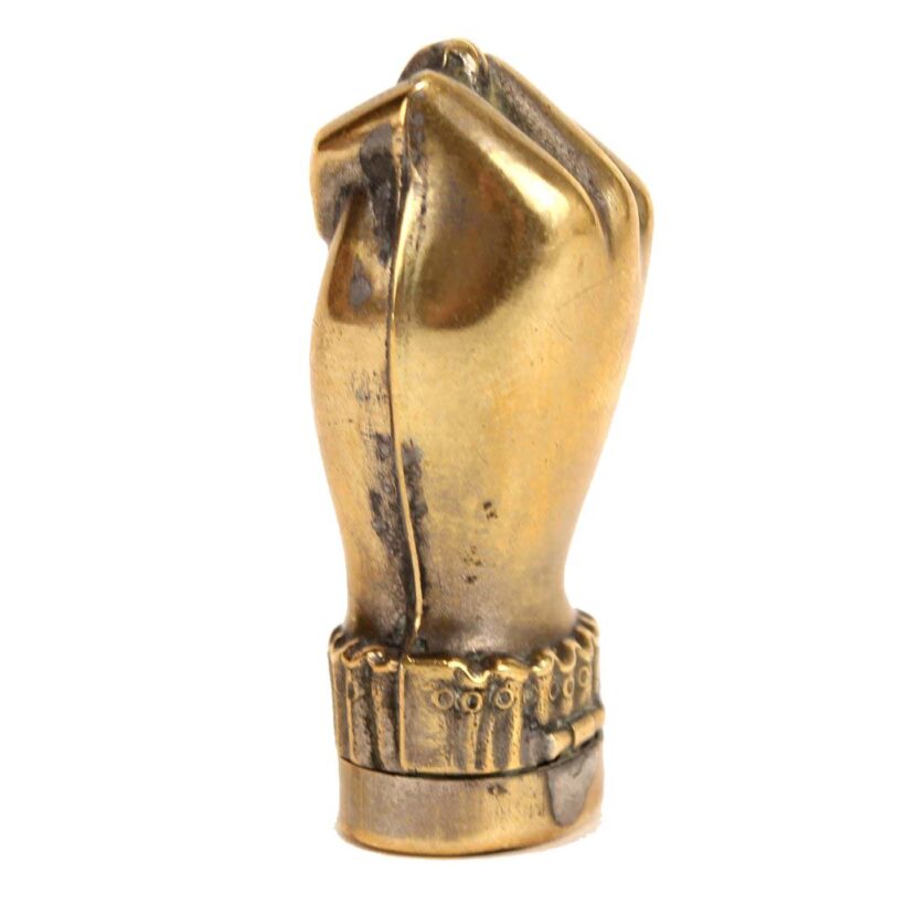Antique brass match safe in the shape of a hand, c. mid-19th century. The figural vesta (pocket match holder) opens at the cuff to reveal matches, the lid crosshatched as a strike plate. At just over two inches tall, the details of the fingers and ruffled shirt sleeve are remarkably fine. The raised fist has come to represent resistance and revolution, and in keeping with the metaphor, this fist is ready to start a fire.