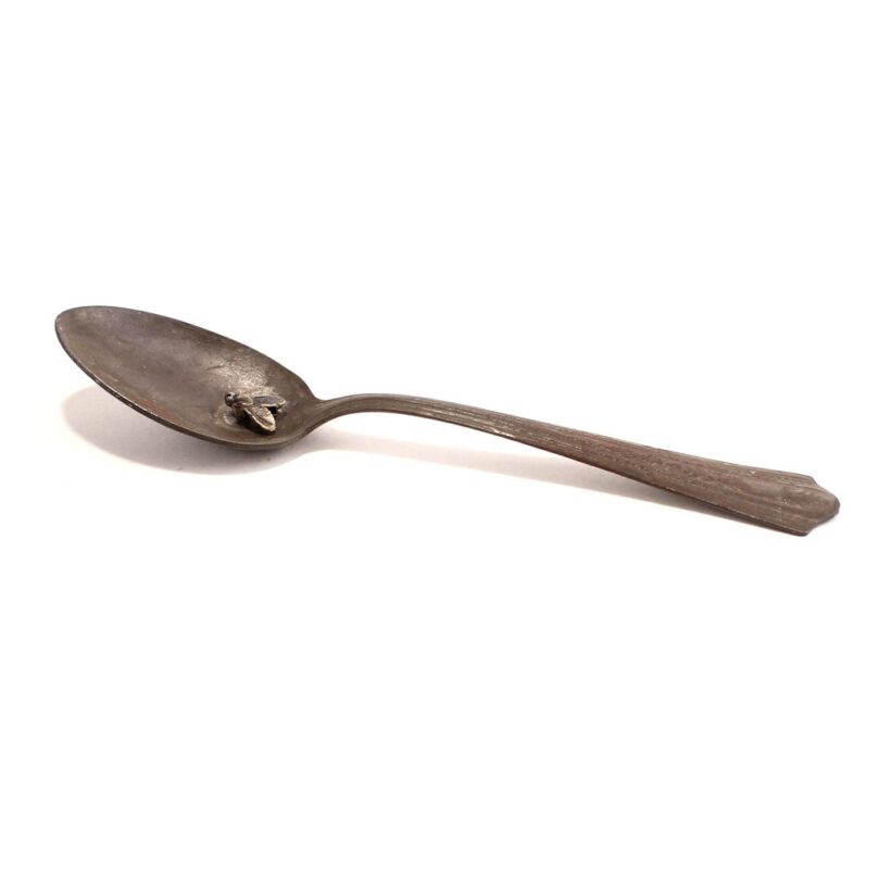 Tarnished and with much of the silverplate worn away, the spoon seems to embody a kind of pessimism, the depressive hopelessness of universal rotten luck: not only is a fly in my soup, the fly will always be in my soup, and indeed, I will put it there. But in its silly way, the spoon reminds us that our experiential perspective is arbitrary and changeable. Aware of the pathetic joke by our own hand, we can choose to exchange the self-imposed fly for a clean utensil and begin the next course without the unpleasant expected surprise.