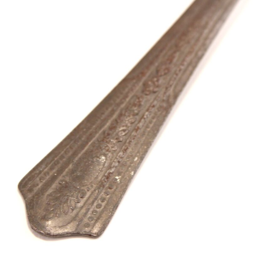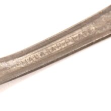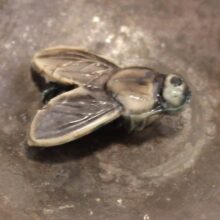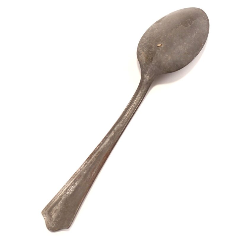 Joke spoon with embedded fly, c. 1930s. The jokester would serve a bowl of soup with the gag spoon in place, giving the diner a start (and perhaps a shirt splatter) with the first sip. Given its timeworn condition, the spoon appears to have been oddly well used given that it was manufactured as a gag. The fly is apparently plastic and mounted on a pin, allowing it to rotate in the bowl.