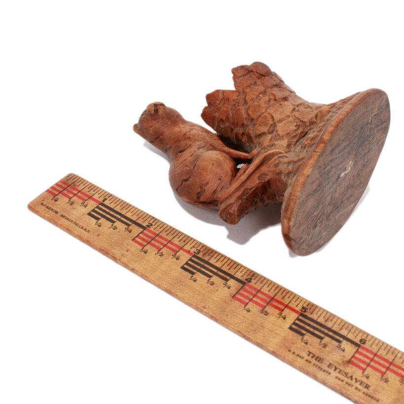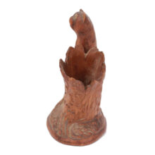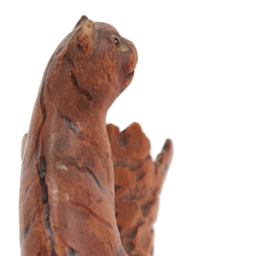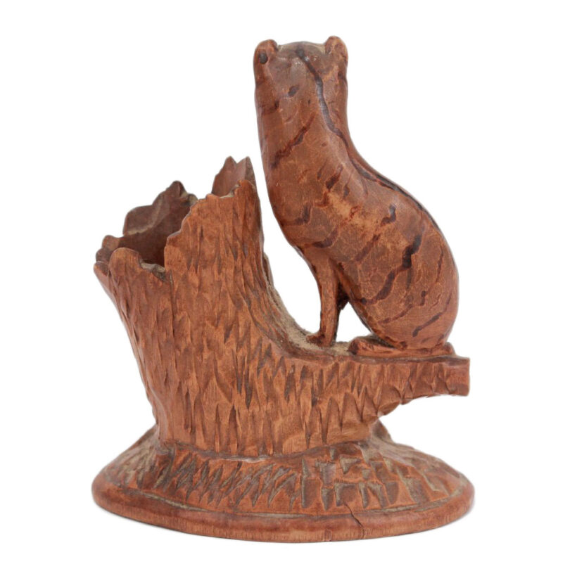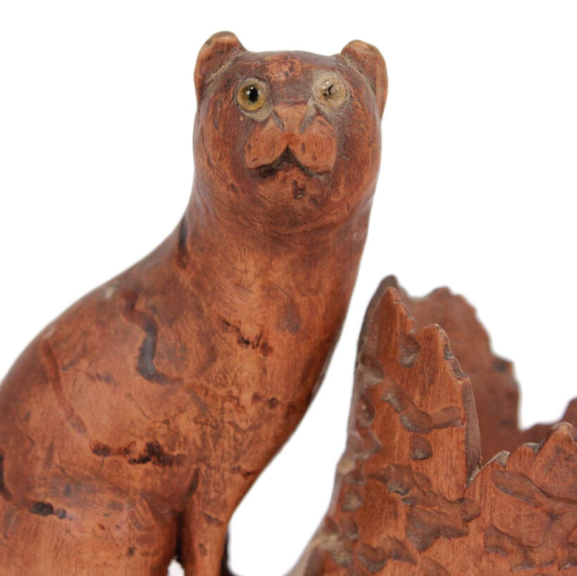 Antique hand-carved figural toothpick holder depicting a cat or tiger, c. mid-nineteenth century. The cat has glass eyes and is beautifully carved and detailed. An exceptional piece of American folk art in miniature.