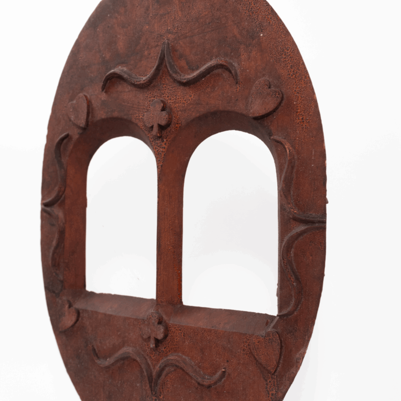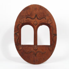 Folk art frame hand-carved from a single board, with decoration of scrolls, hearts, and clubs apparently carved in relief, with a lovely untouched surface with attic finish. The frame’s dual openings are arched and carved through the one-inch board with a tapering cove. The reverse reveals rough sketches of alternative ornaments of an anchor and cross. Without an inset rabbet, the original framed images appear to have been pinned in place without glass. Now vacant, the frame holds its own as a great piece of American folk art.